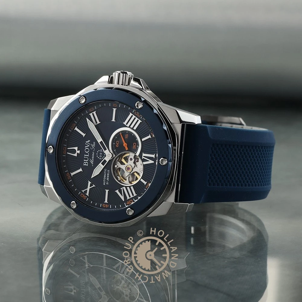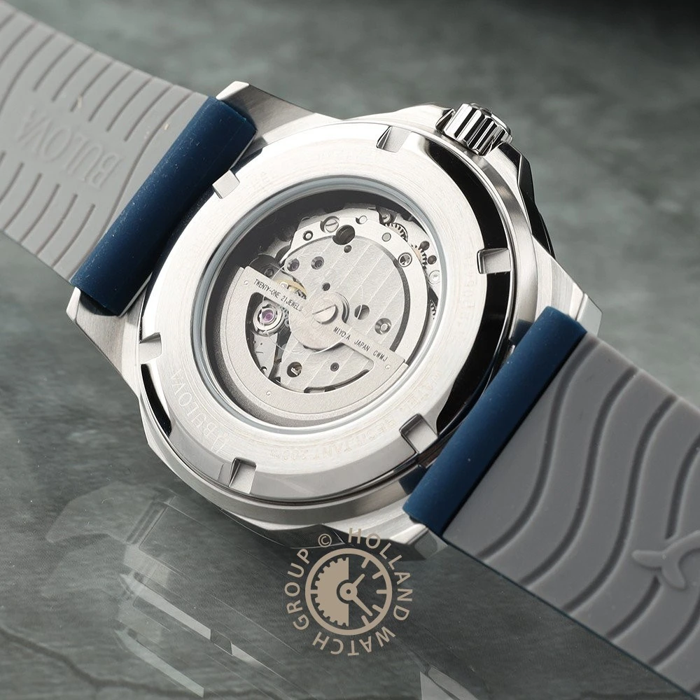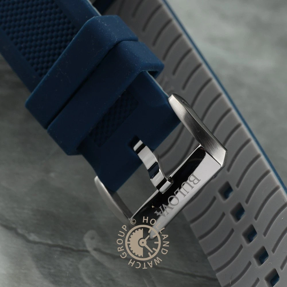 This Bulova watch has a stainless steel case 45 mm in diameter and is fitted with a rubber strap. Inside the case lies a Miyota movement and the watch features a Mineral crystal.