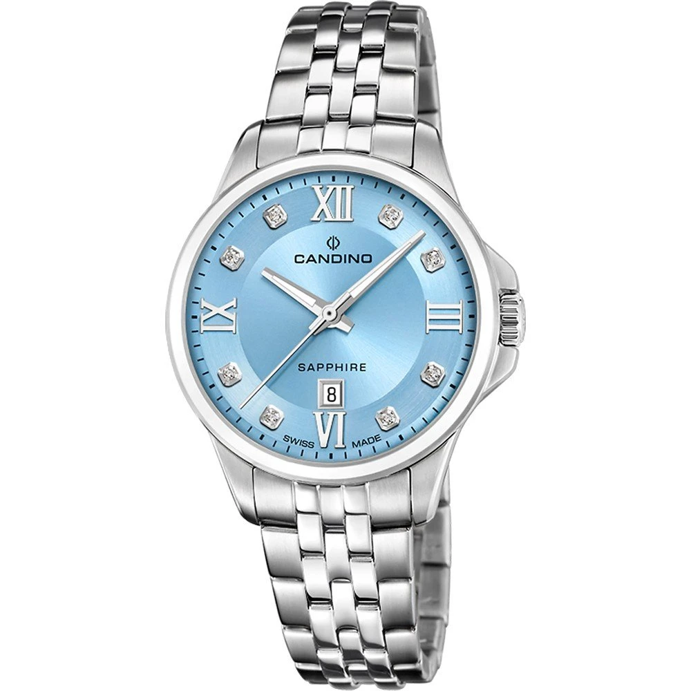 This Candino watch has a case made of stainless steel with a diameter of 34 mm and is fitted with a metal band. Inside the case lies a Ronda movement and the watch features a Sapphire crystal.