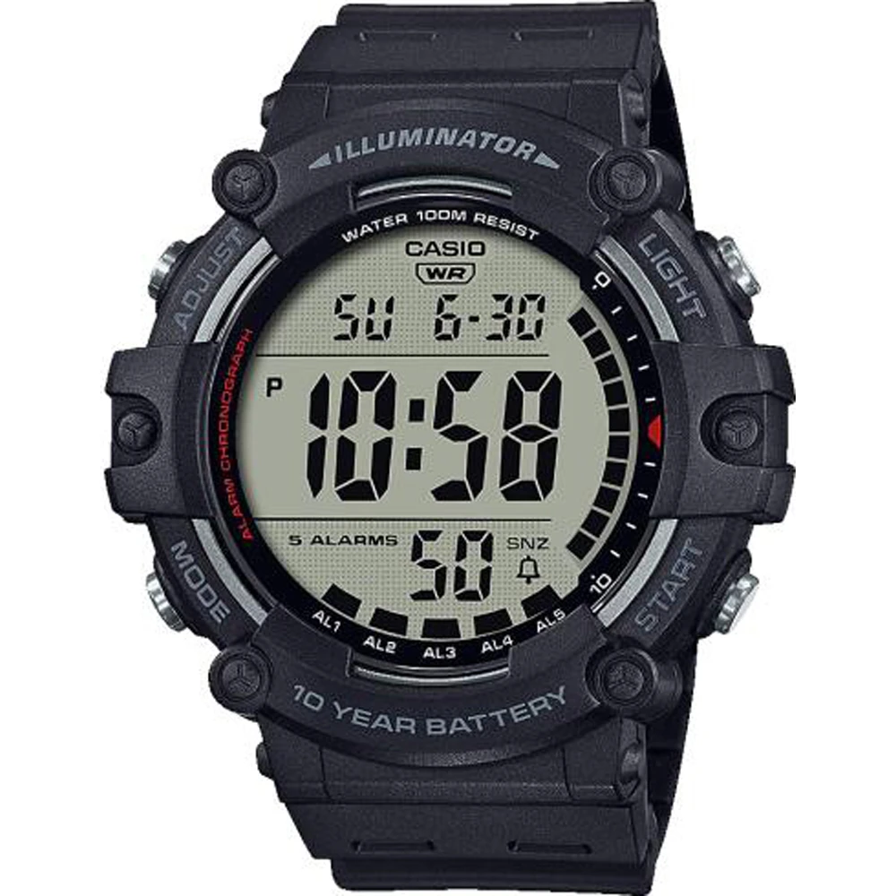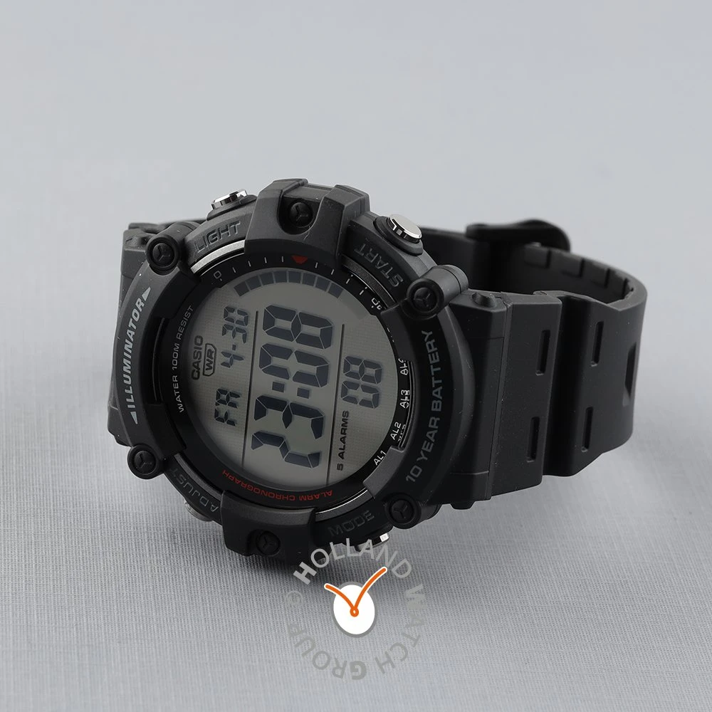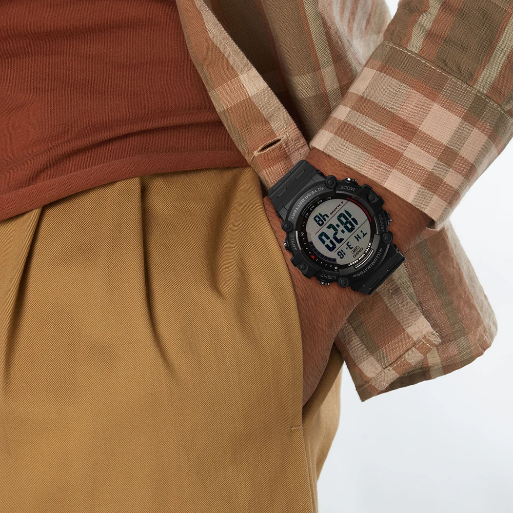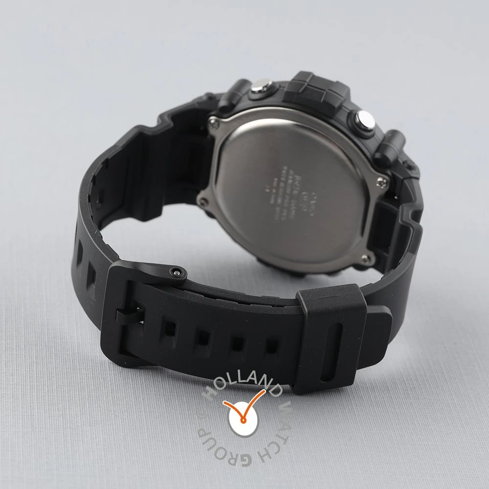 This Casio watch has a case made of plastic with a diameter of 51.2 mm and is fitted with a plastic / resin band. Inside the case lies a Casio movement and the watch features a Plexi crystal.