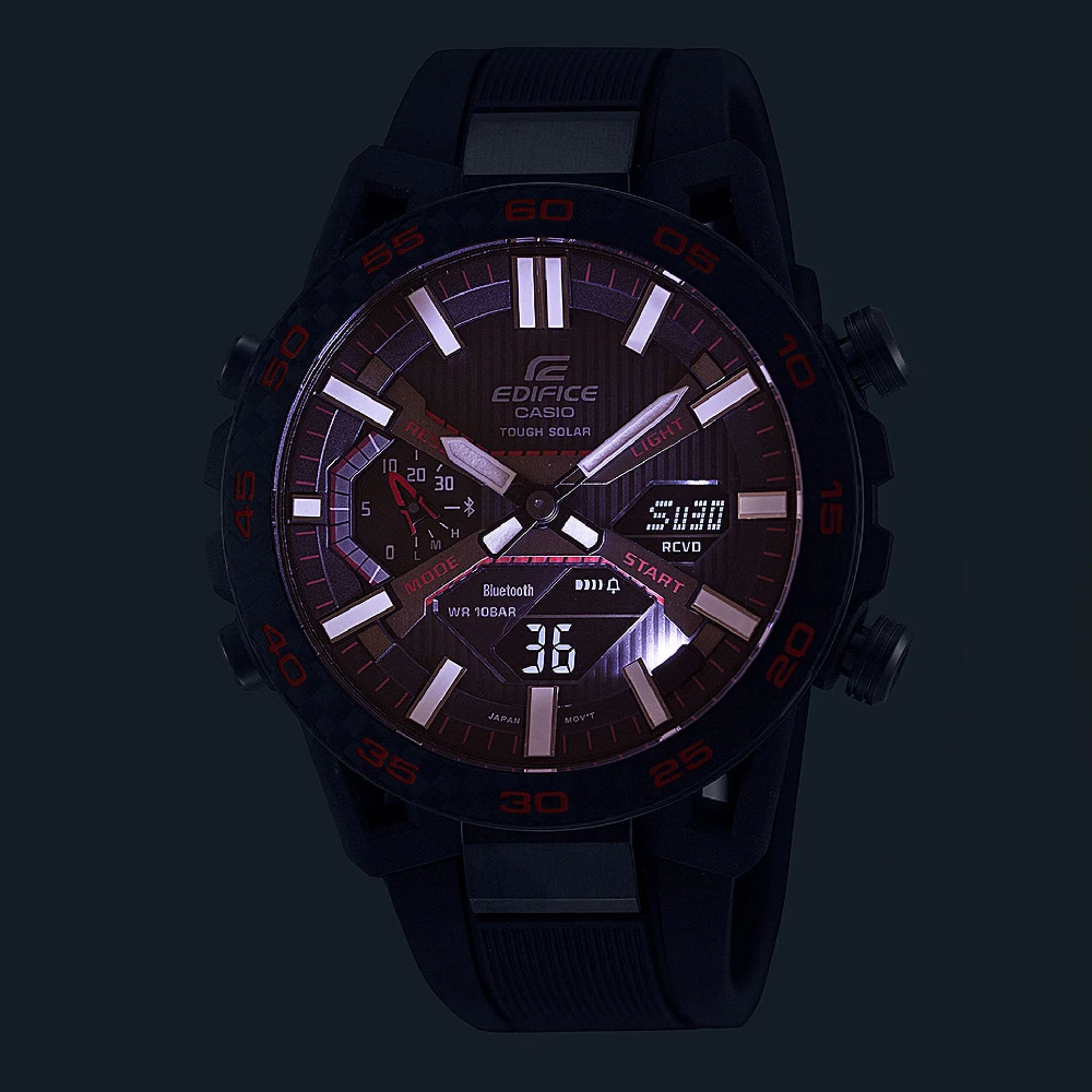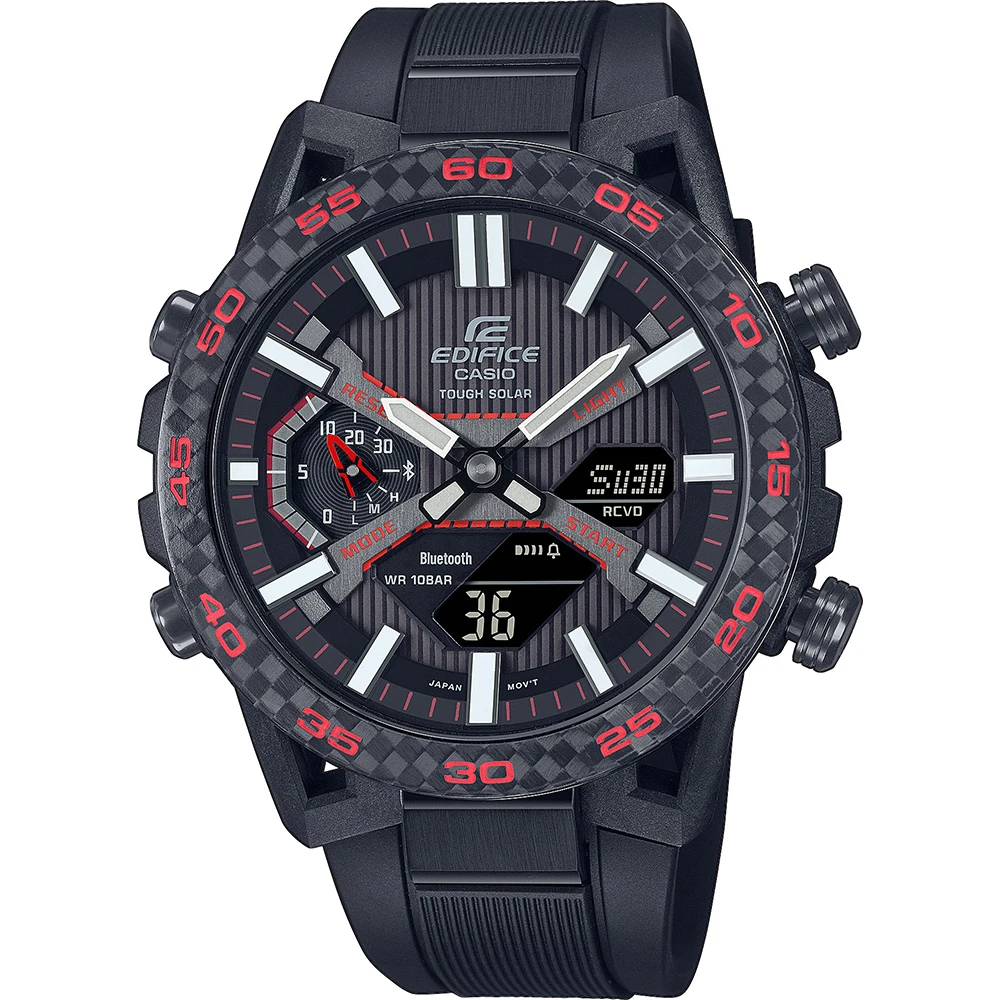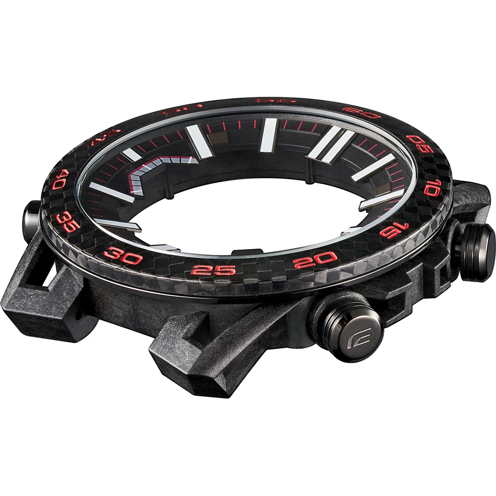 This Casio Edifice watch has a case made of carbon with a diameter of 48 mm and is fitted with a plastic / resin band.