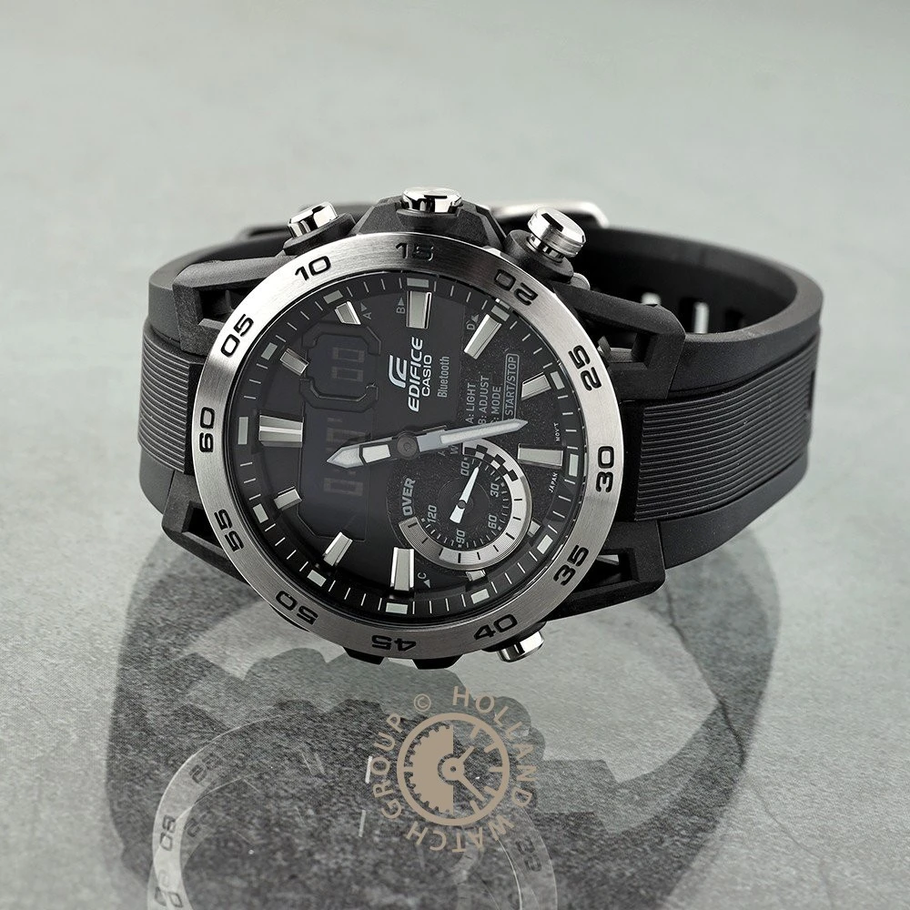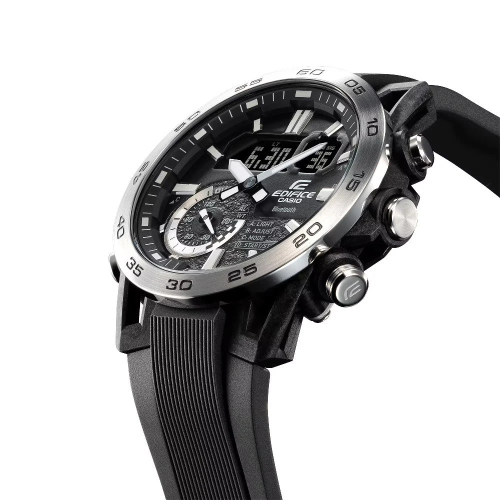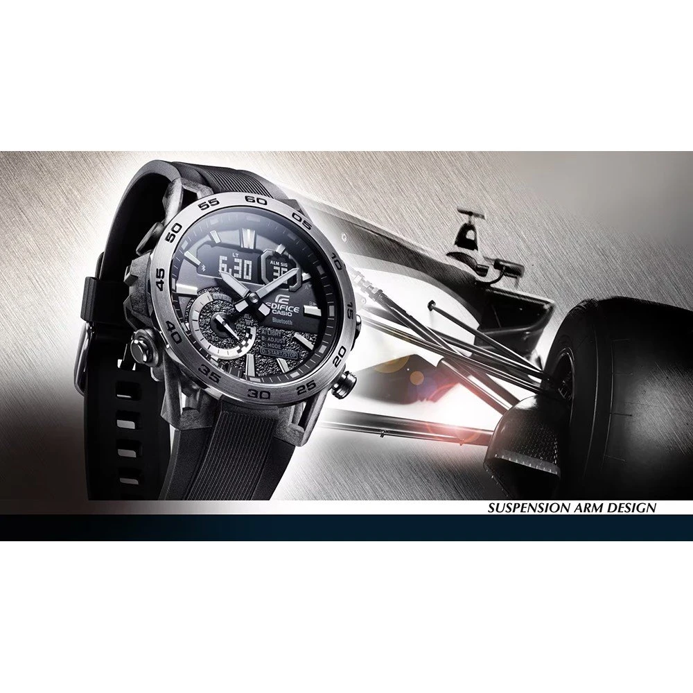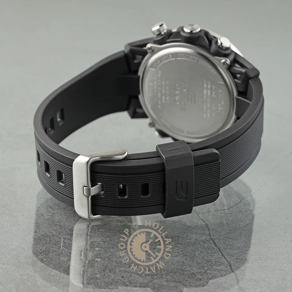 This Casio Edifice watch has a case made of Carbon reinforced resin with a diameter of 46 mm and is fitted with a plastic / resin band. Inside the case lies a Casio movement and the watch features a Mineral crystal.