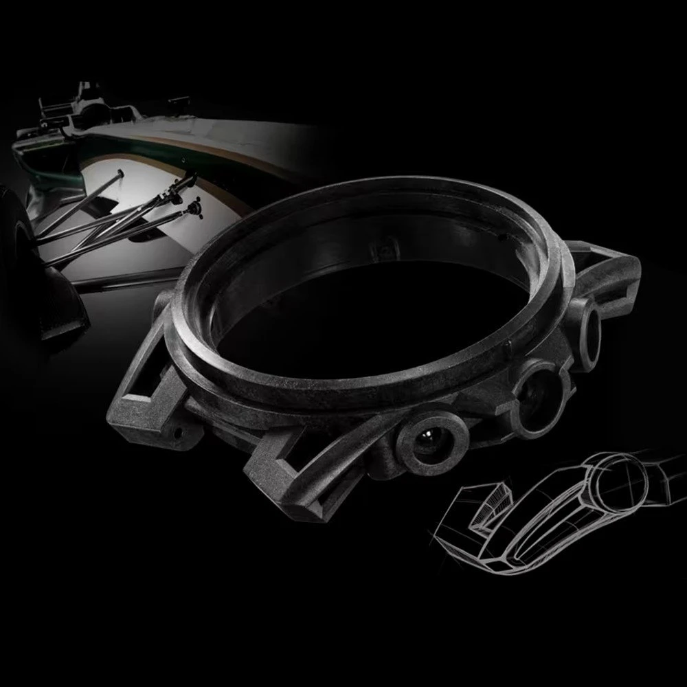 The watch features a carbon fiber reinforced resin case and Smartphone Link. The unique design of the case is inspired by racing car suspension, with four arms in a double fork suspension, two above and two below. Carbon fiber reinforced resin provides a light, yet strong case. Thanks to Smartphone Link, this special timepiece automatically connects when it comes within range of a paired smartphone.