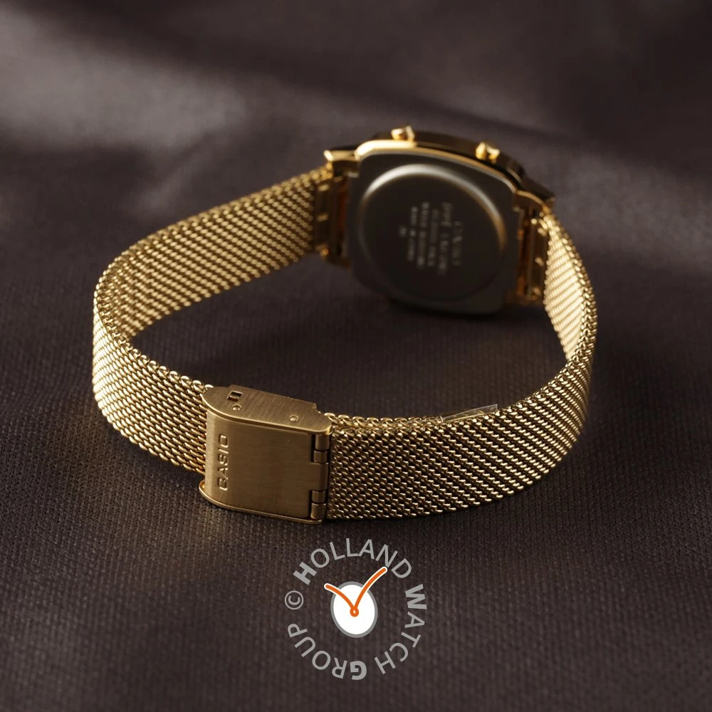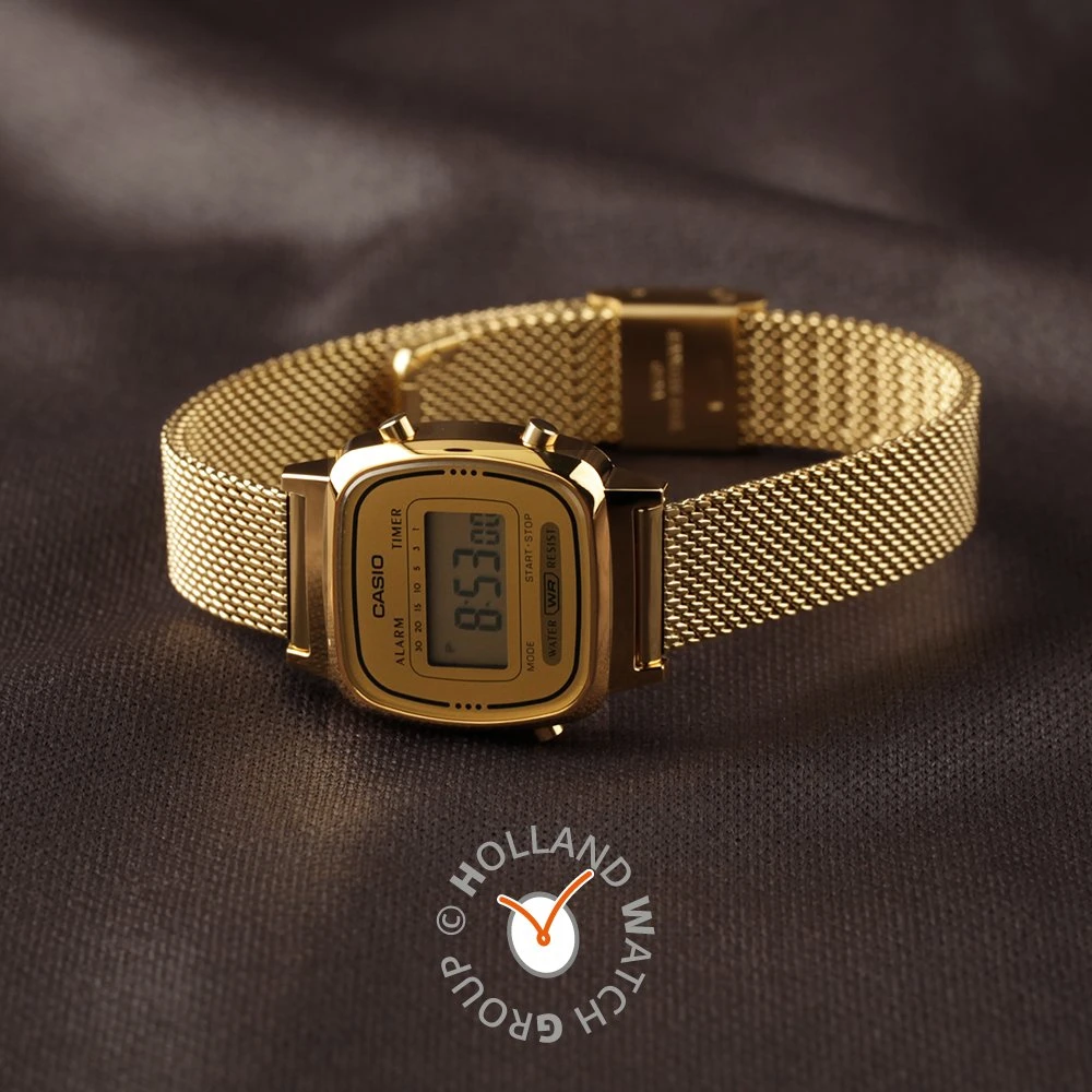 This Casio watch has a case made of plastic with a diameter of 24.6 mm and is fitted with a metal band. Inside the case lies a Casio movement and the watch features a Mineral crystal.