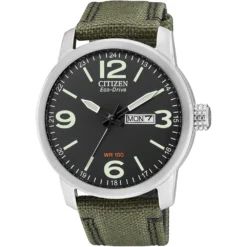 This Citizen watch has a case made of stainless steel with a diameter of 42 mm and is fitted with a Textile over leather band. Inside the case lies a Citizen movement and the watch features a Mineral crystal.