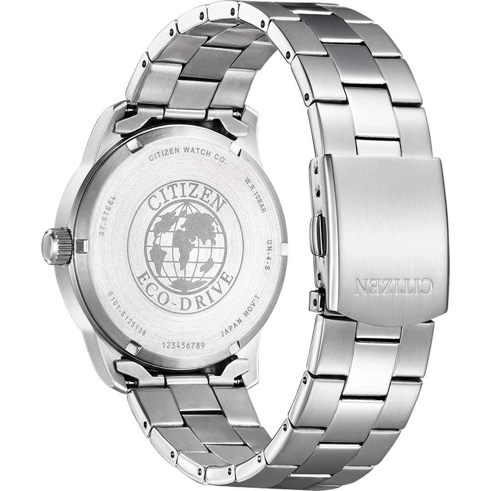 This Citizen watch has a case made of stainless steel with a diameter of 41.8 mm and is fitted with a metal band. Inside the case lies a Citizen movement and the watch features a Mineral crystal.