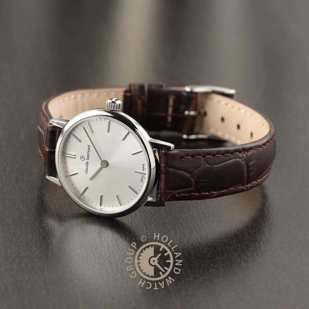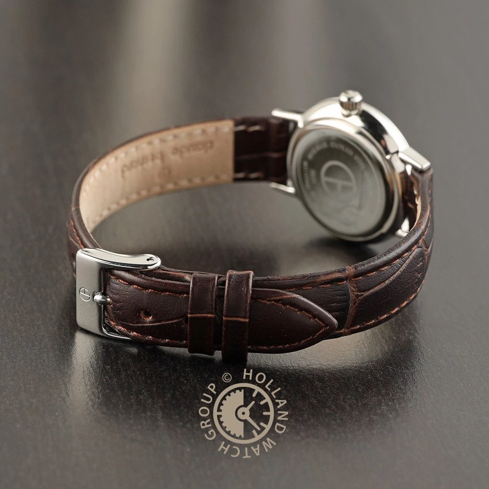 This Claude Bernard watch has a case made of stainless steel with a diameter of 27 mm and is fitted with a leather band. Inside the case lies a Ronda movement and the watch features a Sapphire crystal.
