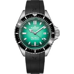 This Edox watch has a stainless steel case 44 mm in diameter and is fitted with a rubber strap. Inside the case lies a Sellita movement and the watch features a Sapphire crystal.