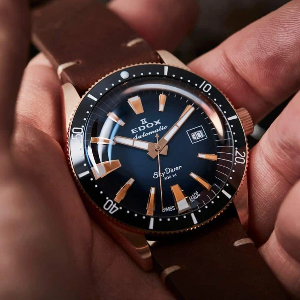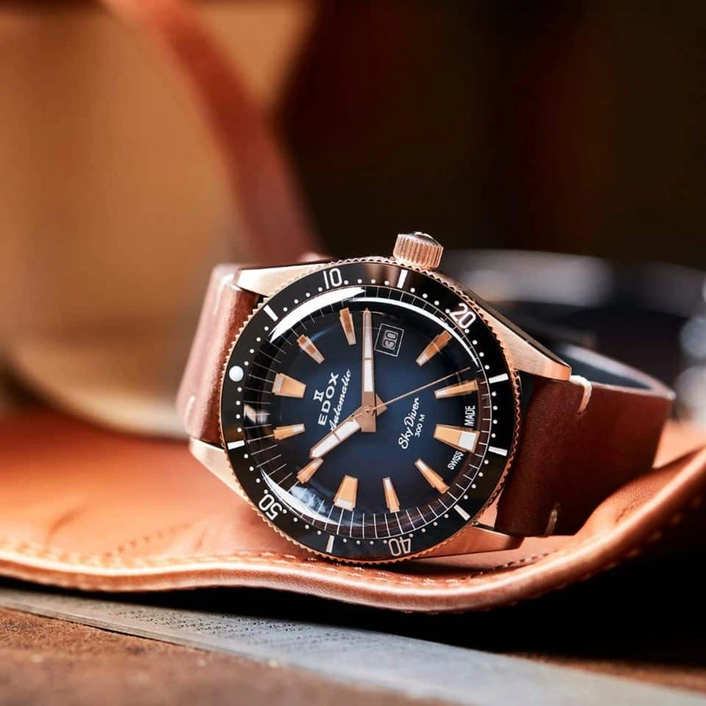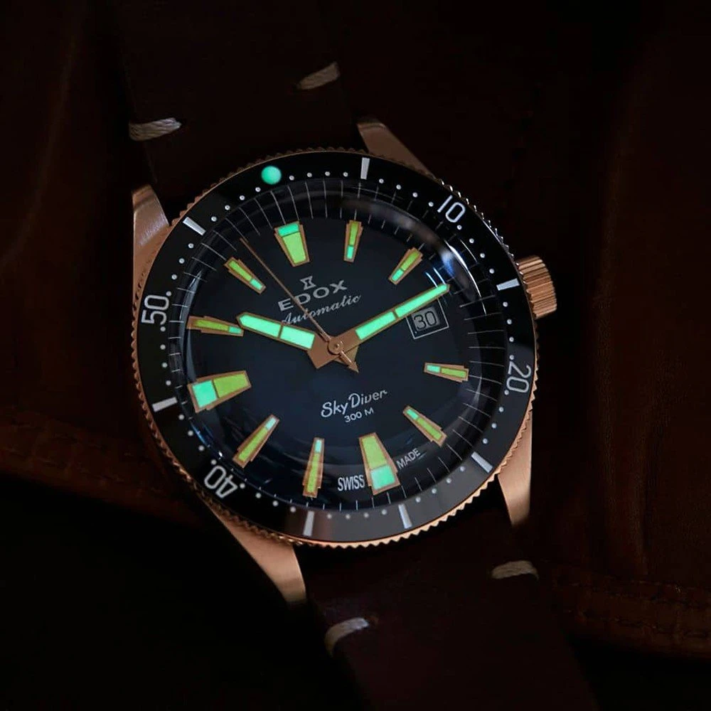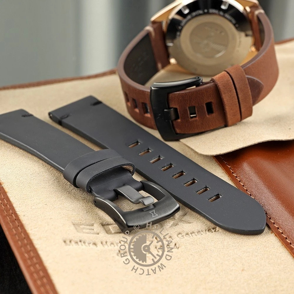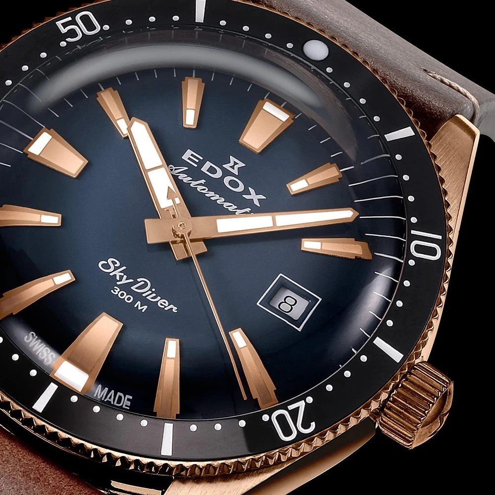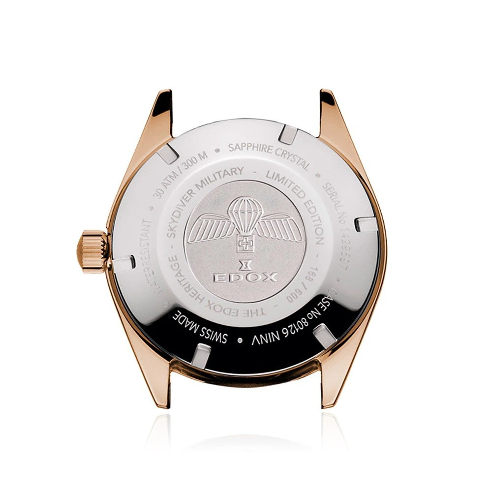 This Edox Skydiver watch is a true tribute to paratroopers. It is a limited edition of which there are only 600 numbered copies on the market. The watch comes with both a brown and black leather watch band that give the watch a vintage character. The beautiful case in which the watch is delivered also has this vintage look and enhances the avian character of the watch.