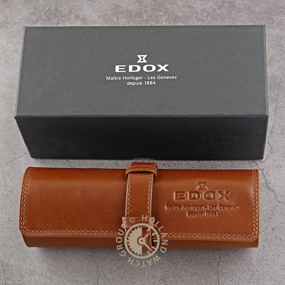 This Edox watch has a case made of stainless steel with a diameter of 42 mm and is fitted with a leather band. Inside the case lies a Sellita movement and the watch features a Sapphire crystal.