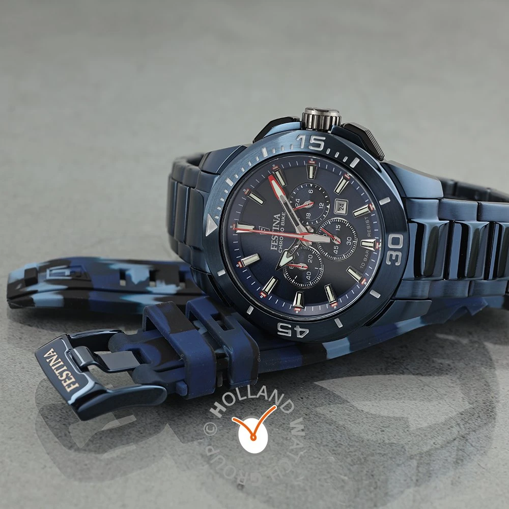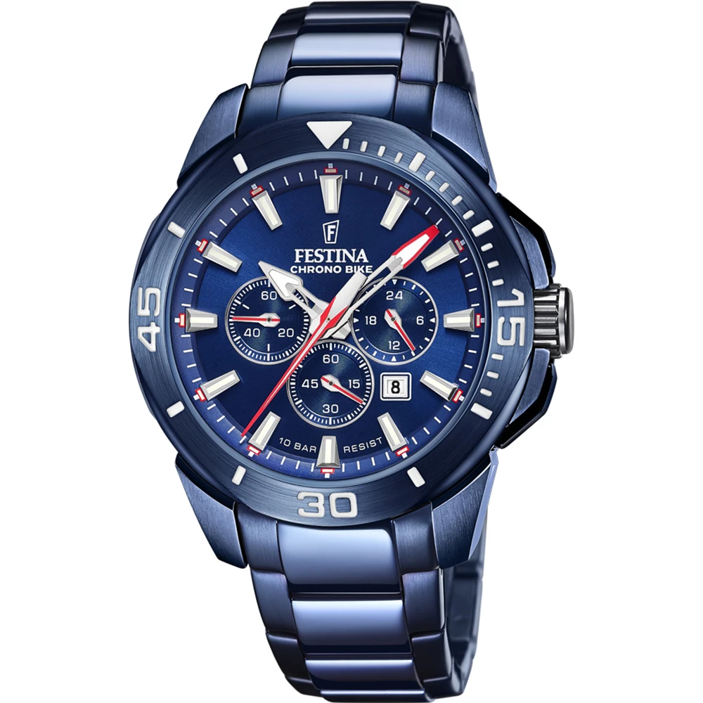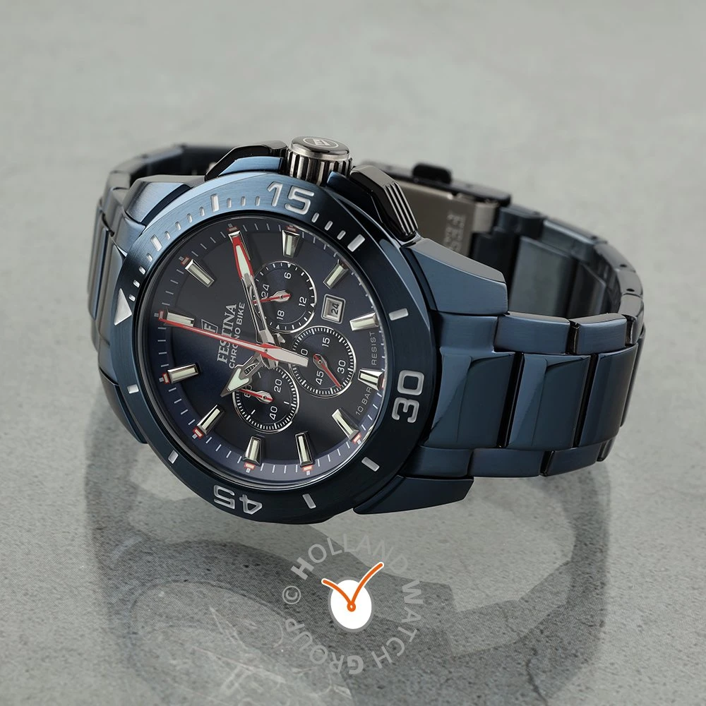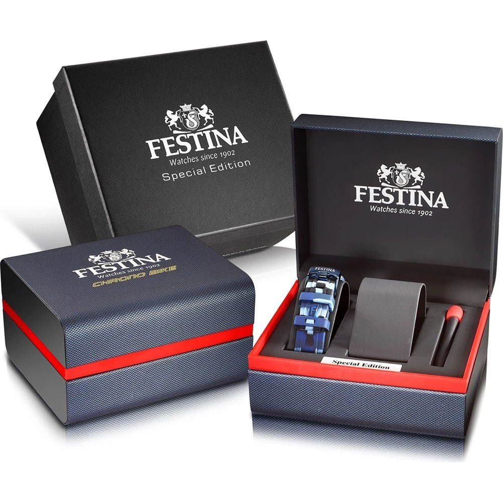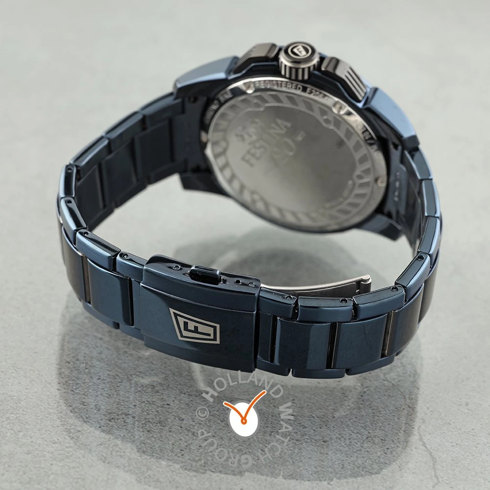 This Festina watch has a case made of stainless steel with a diameter of 47 mm and is fitted with a metal band. Inside the case lies a Miyota movement and the watch features a Mineral crystal.