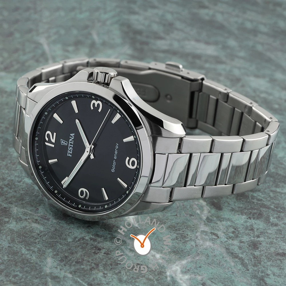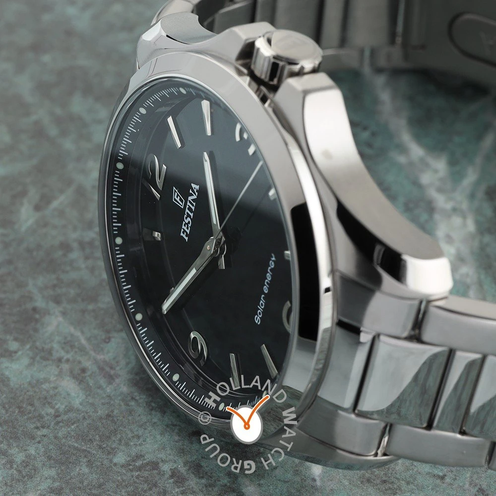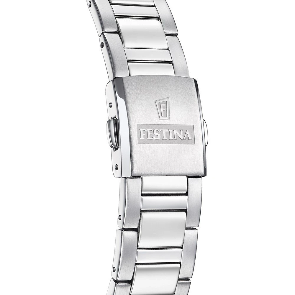 This Festina watch has a case made of stainless steel with a diameter of 41 mm and is fitted with a metal band. Inside the case lies a Miyota movement and the watch features a Mineral crystal.