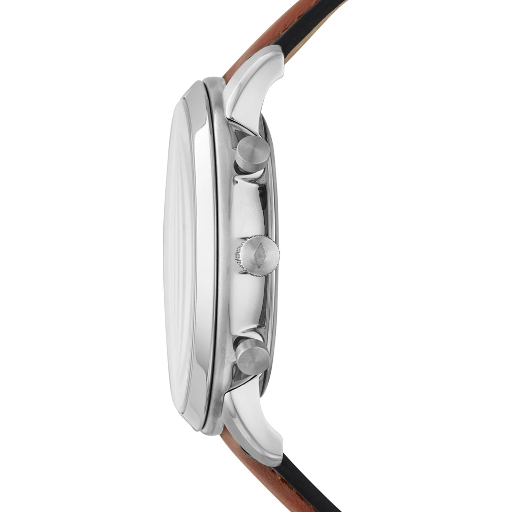 This Fossil watch has a case made of stainless steel with a diameter of 44 mm and is fitted with a leather band. Inside the case lies a Miyota movement and the watch features a Mineral crystal.
