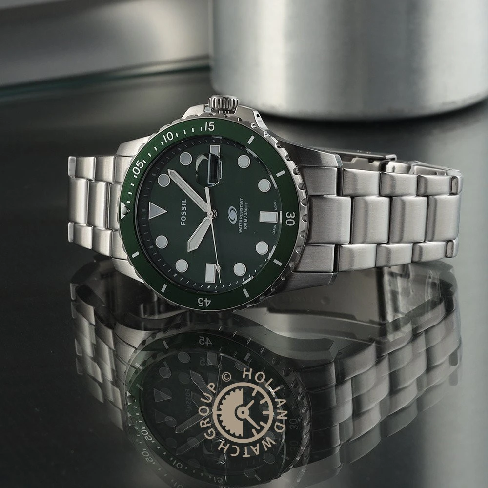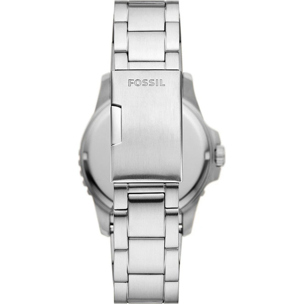 This Fossil watch has a case made of stainless steel with a diameter of 42 mm and is fitted with a metal band. Inside the case lies a Miyota movement and the watch features a Mineral crystal.