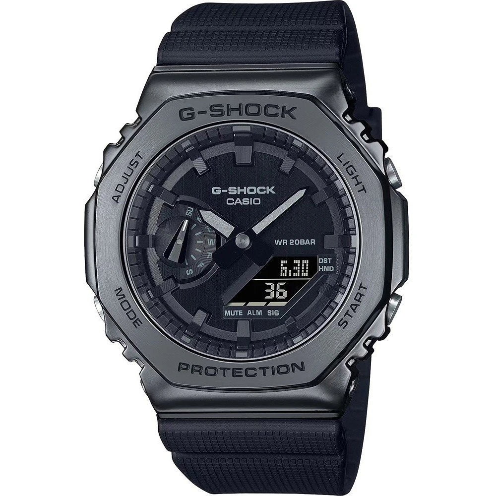 This G-Shock watch has a stainless steel case 44.4 mm in diameter and is fitted with a plastic / resin strap. Inside the case lies a Casio movement and the watch features a Mineral crystal.