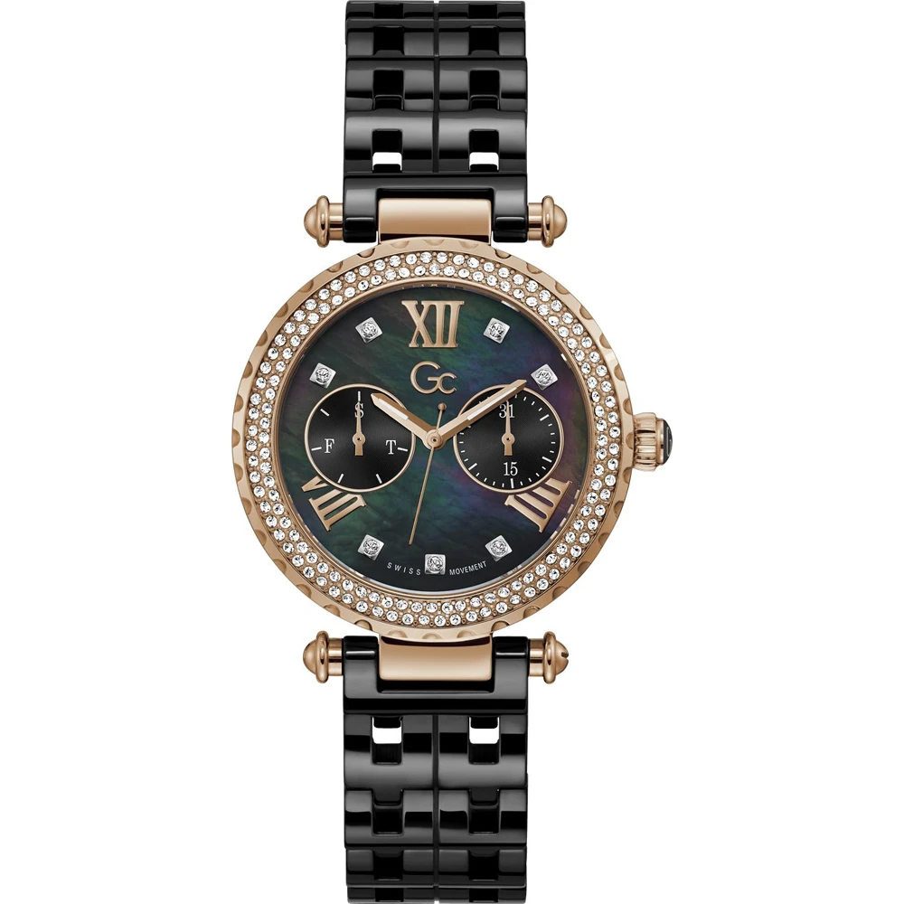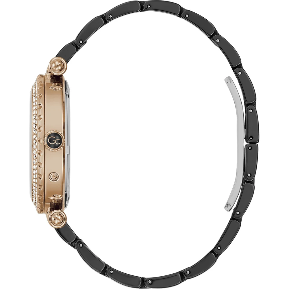 This GC watch has a case made of stainless steel with a diameter of 36.5 mm and is fitted with a ceramic band. Inside the case lies a Ronda movement and the watch features a Sapphire coated mineral crystal.
