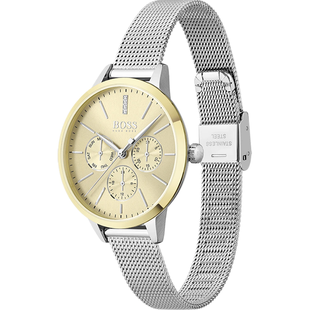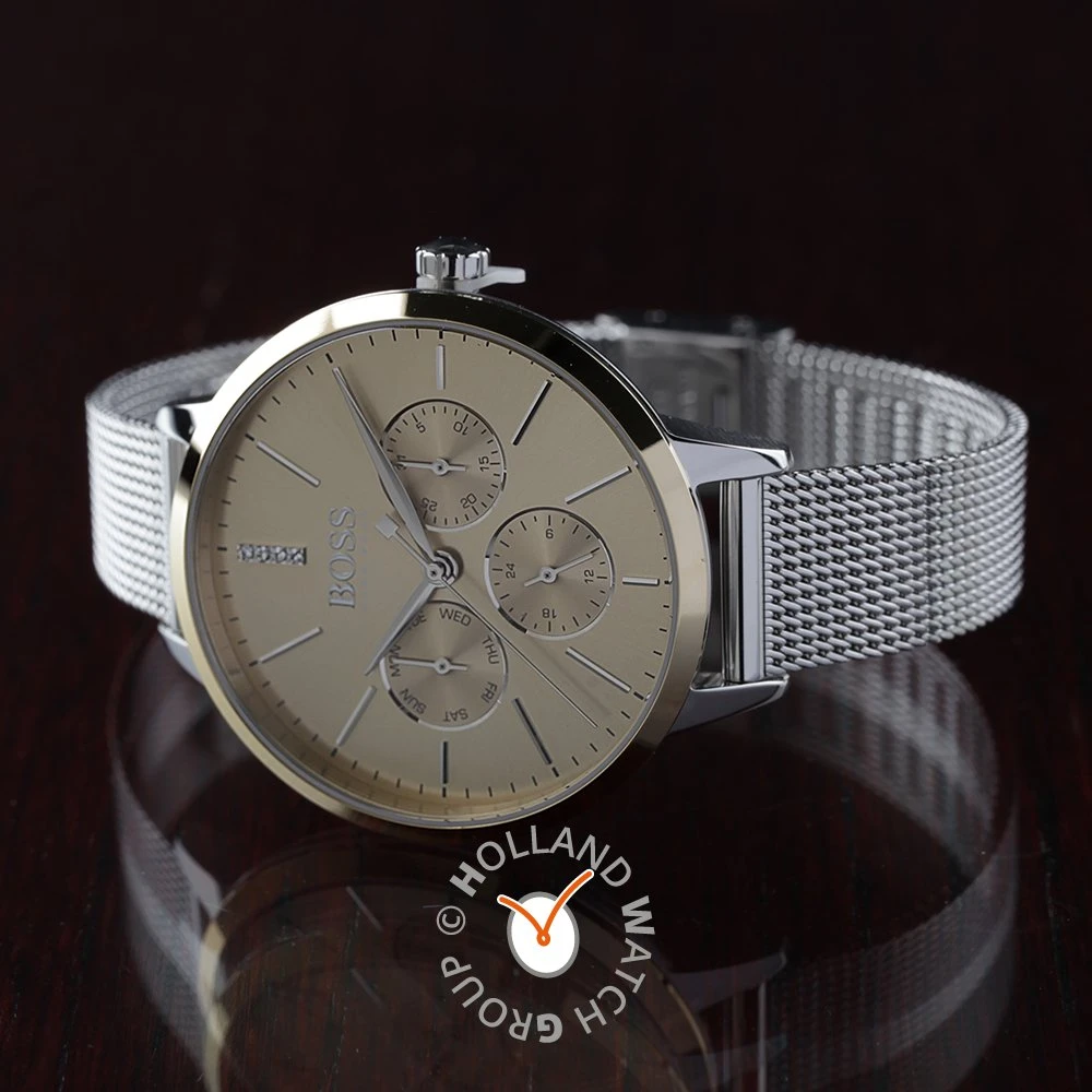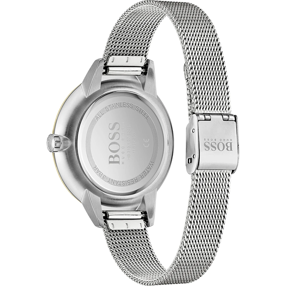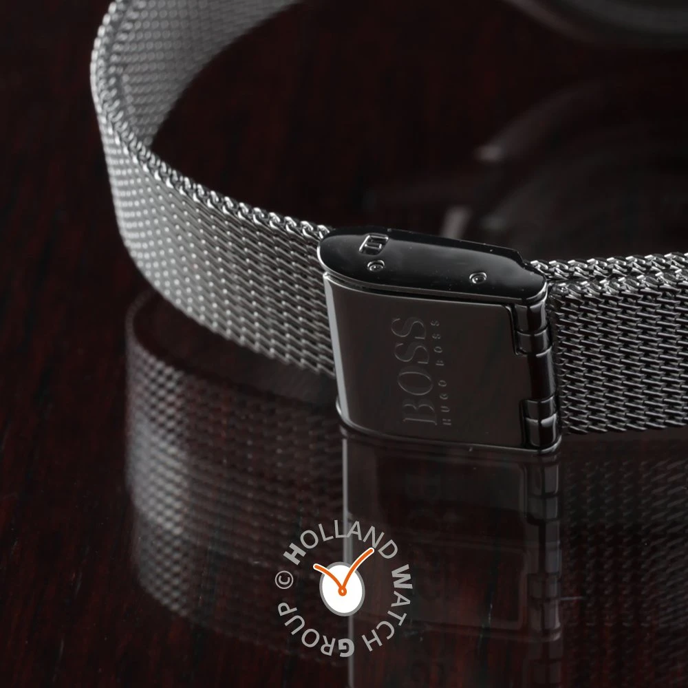 This Hugo Boss watch has a case made of stainless steel with a diameter of 38 mm and is fitted with a metal band. Inside the case lies a Miyota movement and the watch features a Mineral crystal.