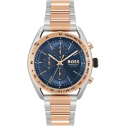 This Hugo Boss watch has a case made of stainless steel with a diameter of 44 mm and is fitted with a metal band. Inside the case lies a Miyota movement and the watch features a Mineral crystal.