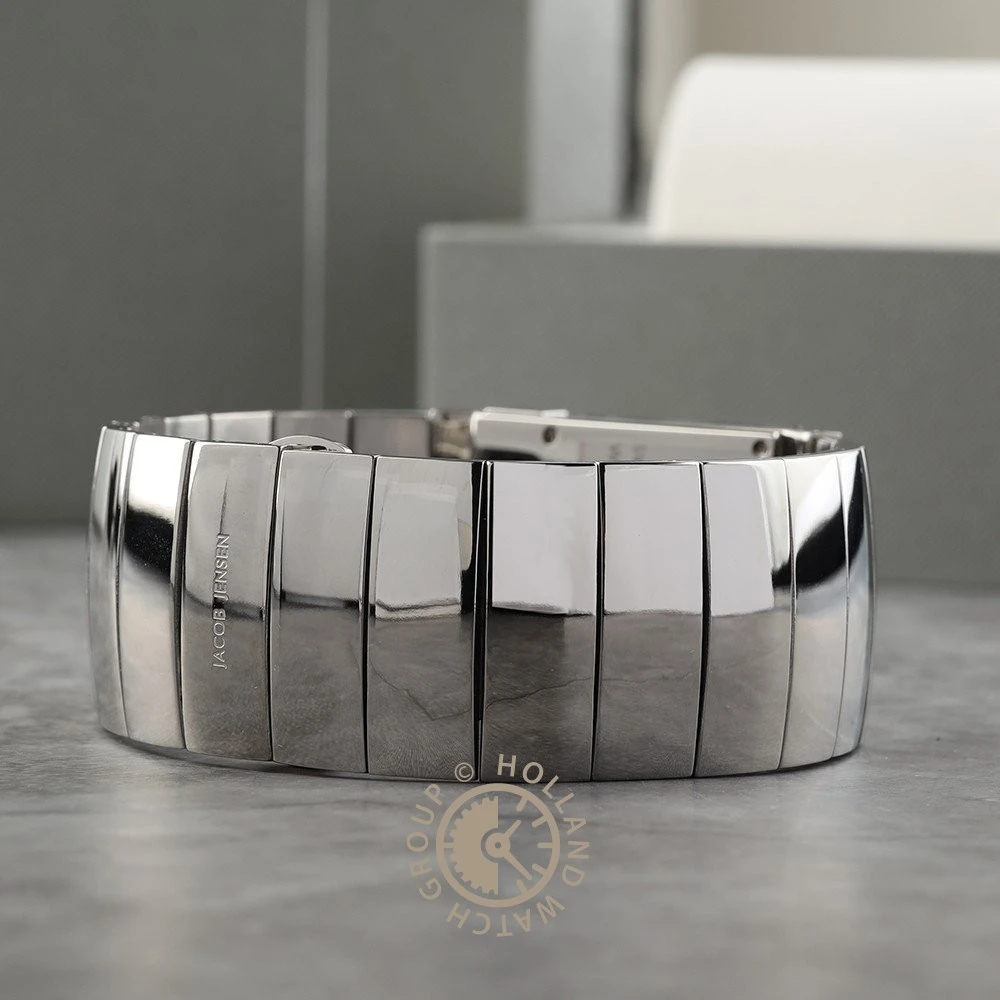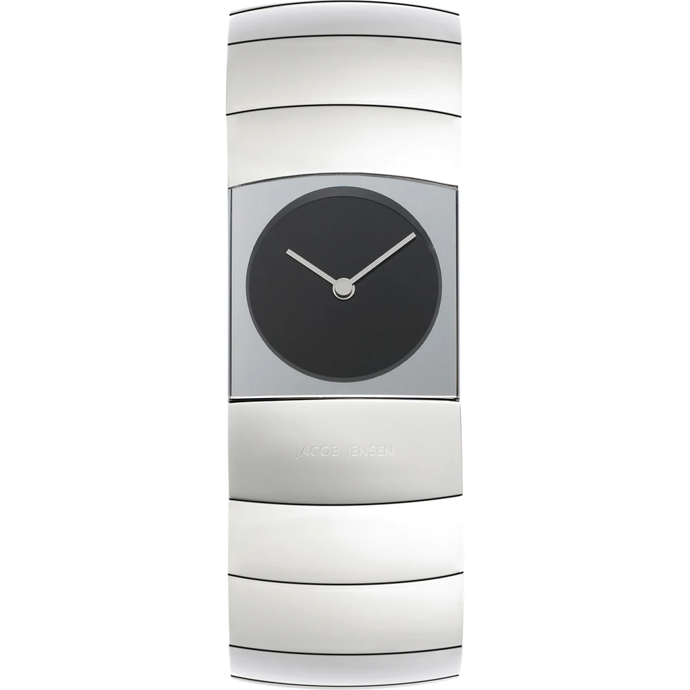 This Jacob Jensen watch has a case made of titanium with a diameter of 22 mm and is fitted with a metal band. Inside the case lies a Ronda movement and the watch features a Sapphire crystal.