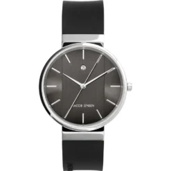 This Jacob Jensen watch has a case made of stainless steel with a diameter of 35 mm and is fitted with a rubber band. Inside the case lies a Ronda movement and the watch features a Mineral crystal.