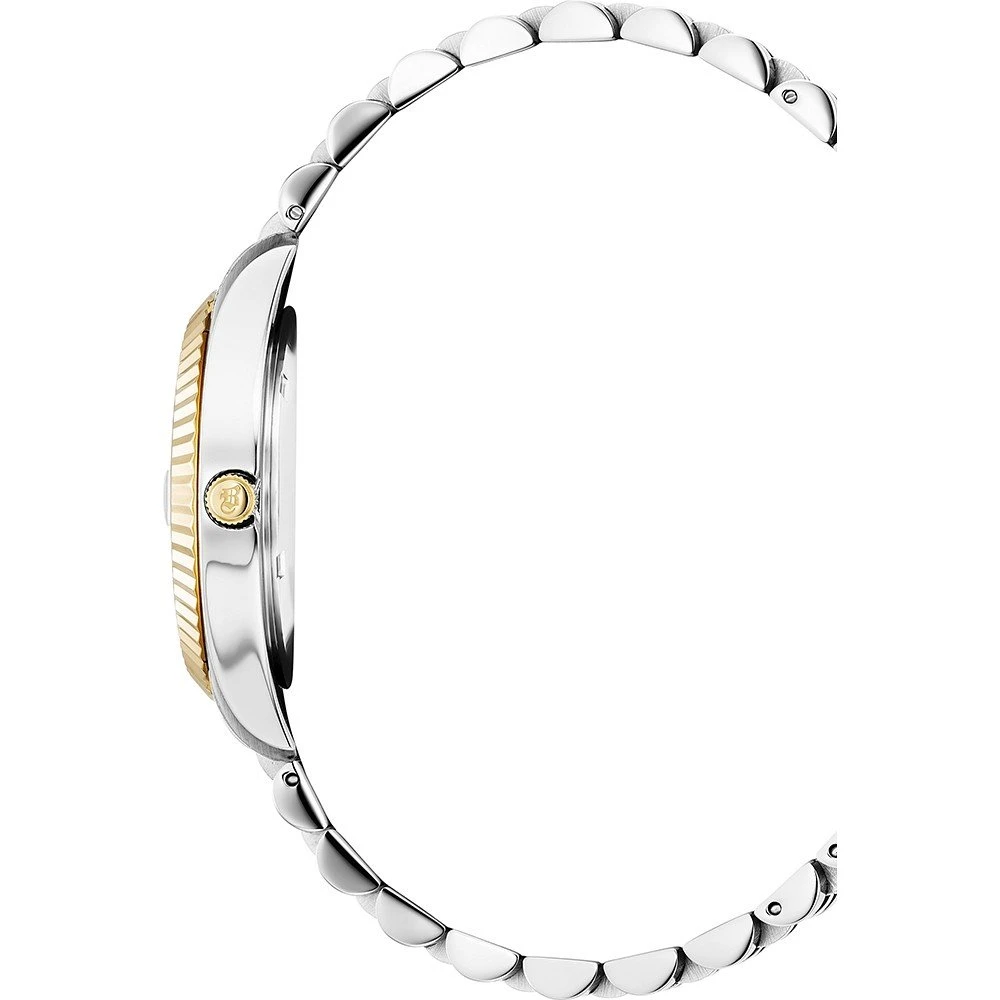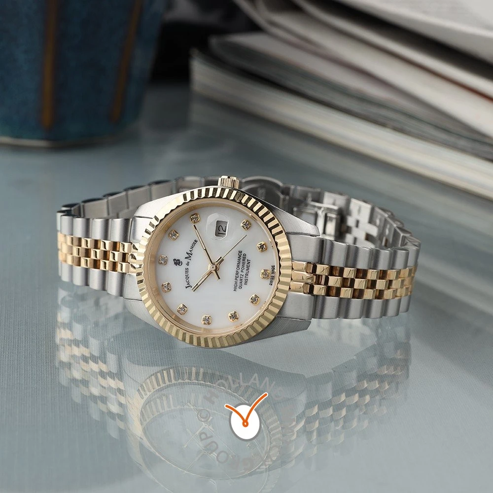 This Jacques du Manoir watch has a case made of stainless steel with a diameter of 31 mm and is fitted with a metal band.