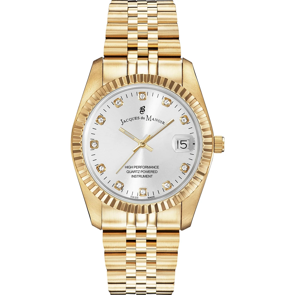 This Jacques du Manoir watch has a case made of stainless steel with a diameter of 36 mm and is fitted with a metal band. Inside the case lies a Ronda movement and the watch features a Mineral crystal.
