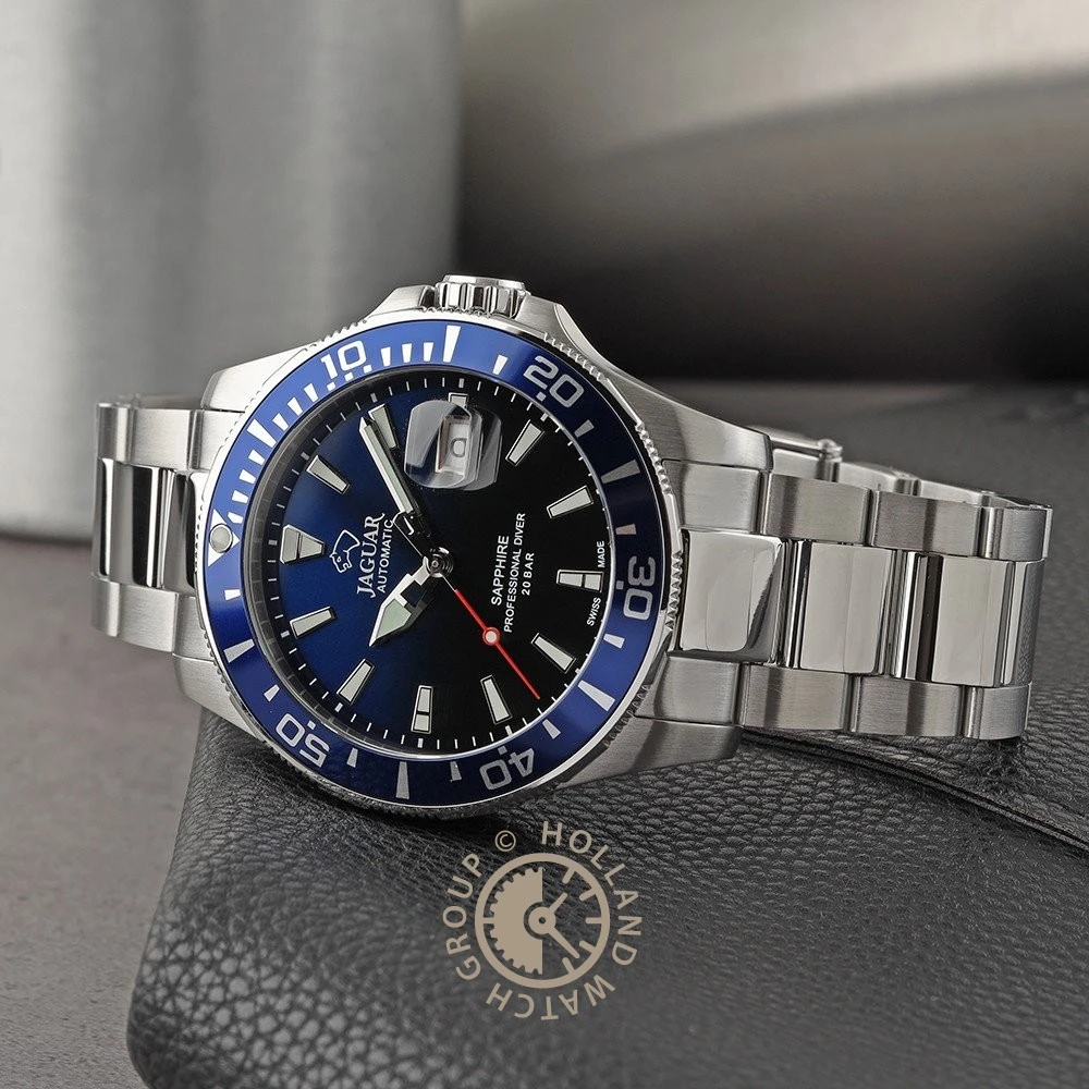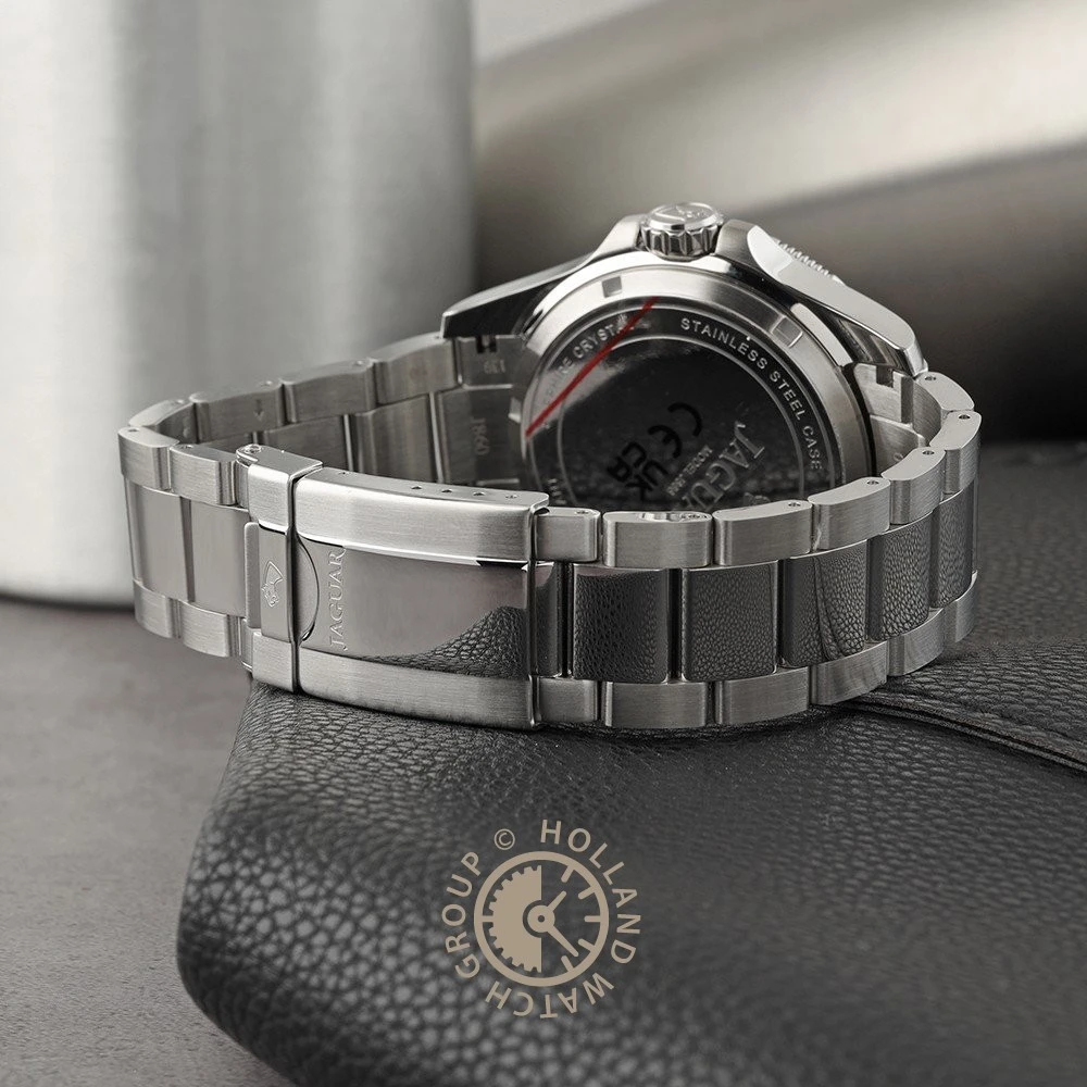 This Jaguar watch has a stainless steel case 43 mm in diameter and is fitted with a metal strap. Inside the case lies a ETA movement and the watch features a Sapphire crystal.