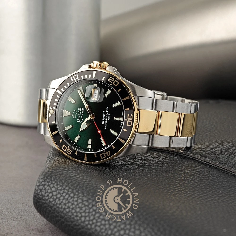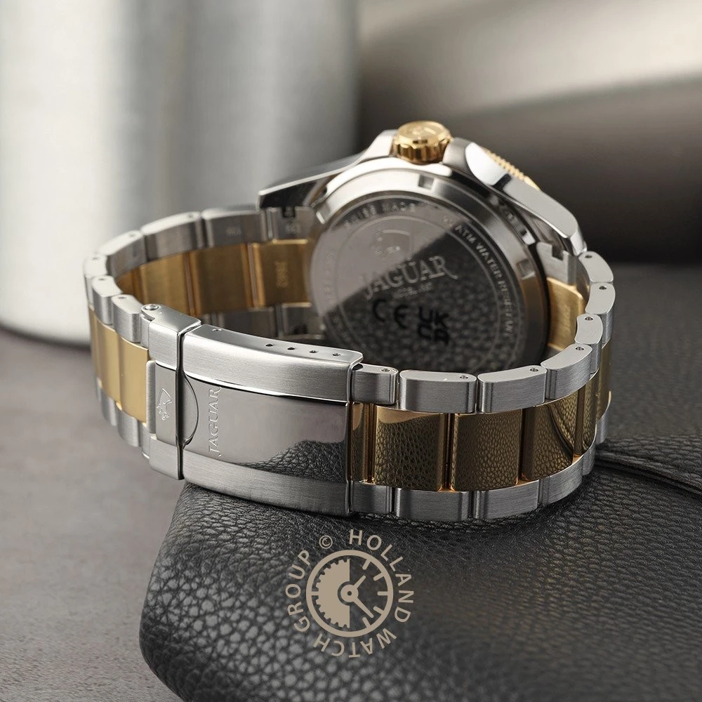 This Jaguar watch has a stainless steel case 43 mm in diameter and is fitted with a metal strap. Inside the case lies a ETA movement and the watch features a Sapphire crystal.