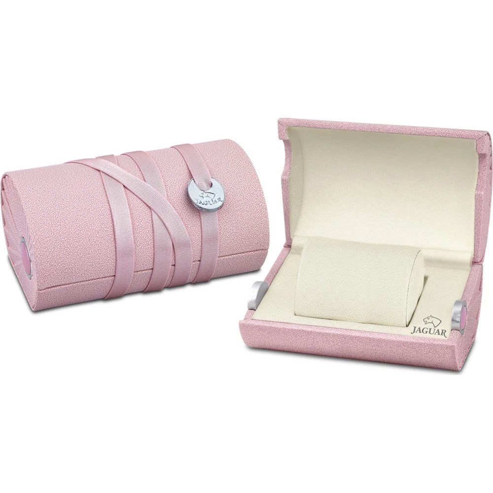 This Jaguar watch has a stainless steel case 34 mm in diameter and is fitted with a metal strap. Inside the case lies a Ronda movement and the watch features a Sapphire crystal.