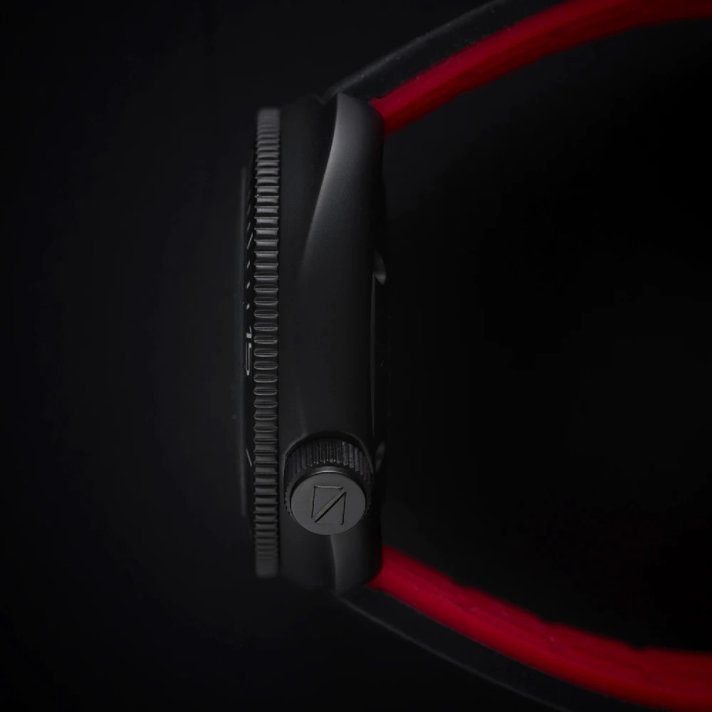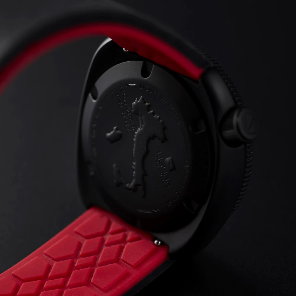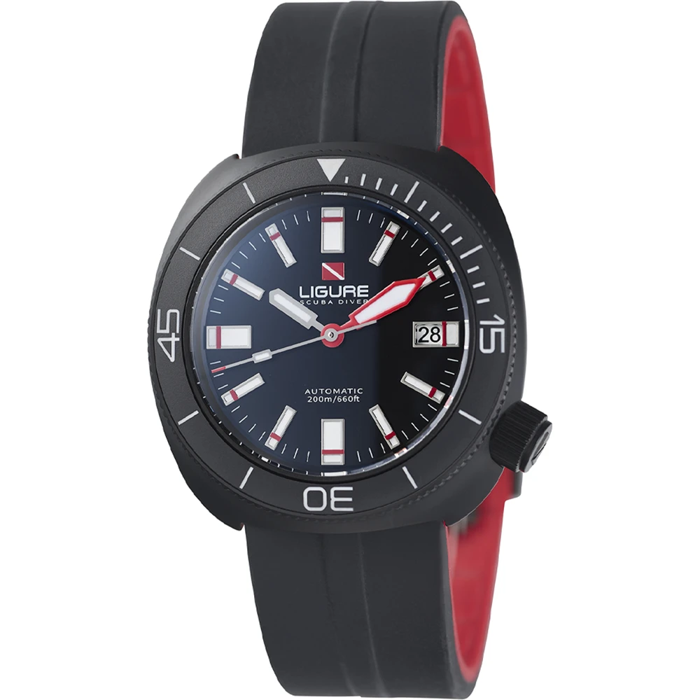 This Ligure watch has a stainless steel case 41 mm in diameter and is fitted with a rubber strap. Inside the case lies a Sellita movement and the watch features a Sapphire crystal.