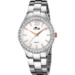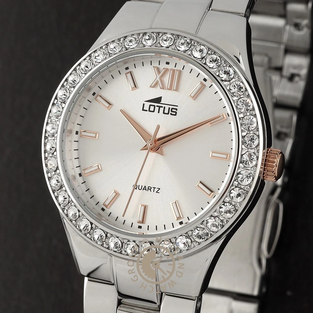 This Lotus watch has a case made of stainless steel with a diameter of 32 mm and is fitted with a metal band. Inside the case lies a Miyota movement and the watch features a Mineral crystal.