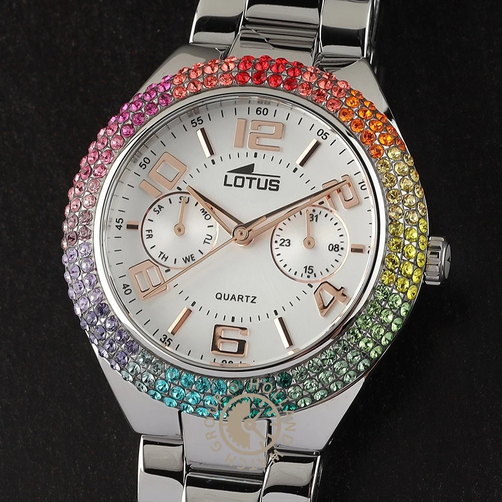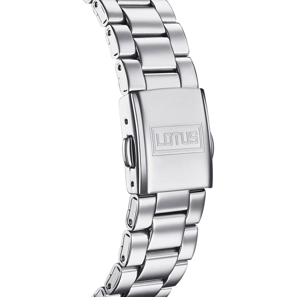 This Lotus watch has a case made of stainless steel with a diameter of 39 mm and is fitted with a metal band. Inside the case lies a Miyota movement and the watch features a Mineral crystal.