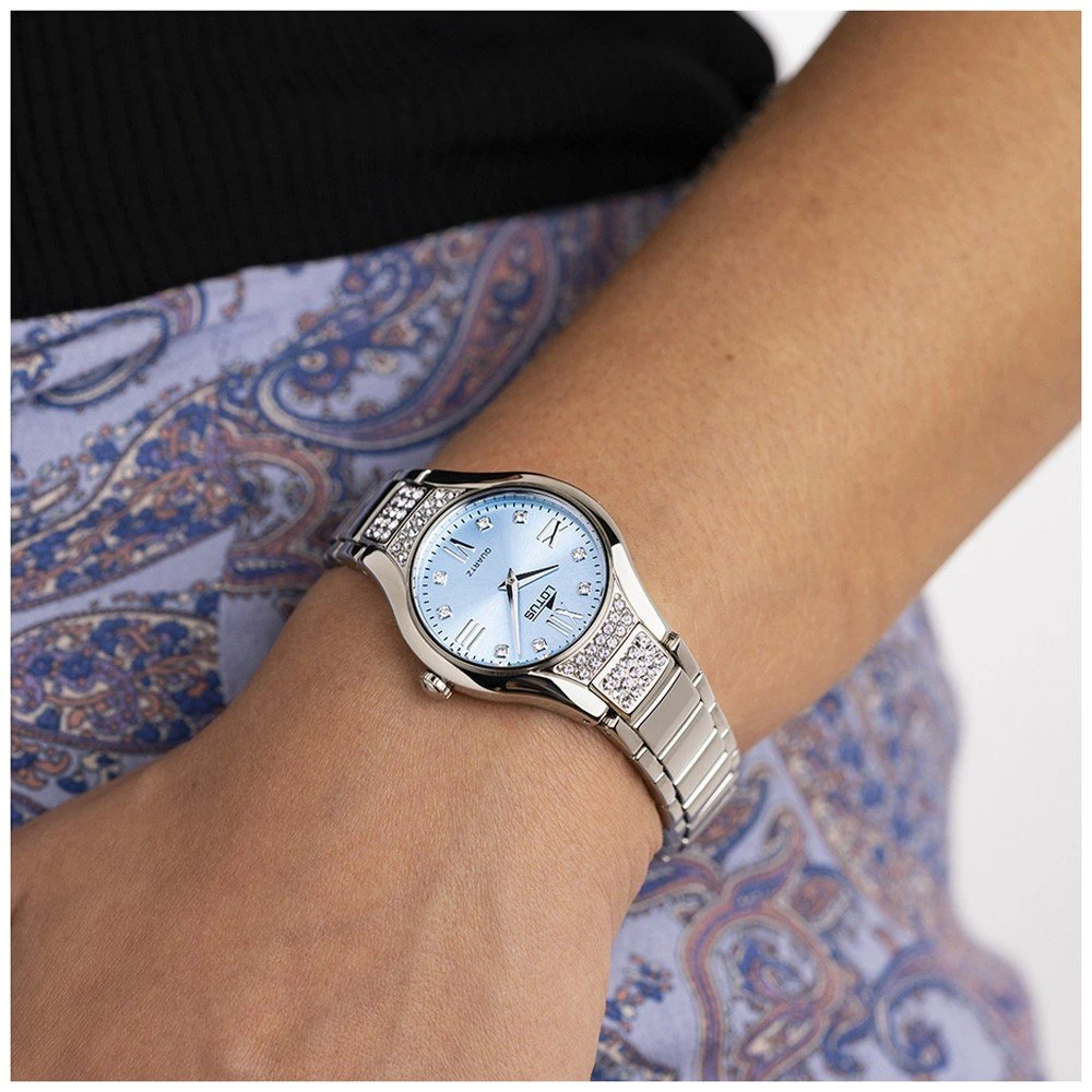 This Lotus watch has a case made of stainless steel with a diameter of 32 mm and is fitted with a metal band. Inside the case lies a Miyota movement and the watch features a Mineral crystal.