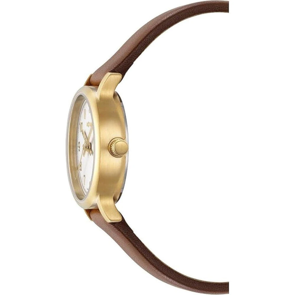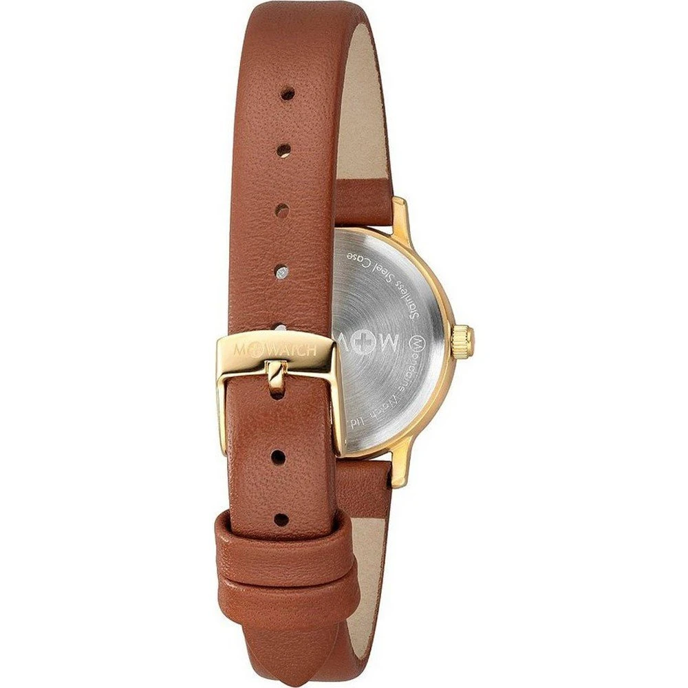 This M-Watch by Mondaine watch has a case made of stainless steel with a diameter of 25 mm and is fitted with a leather band. Inside the case lies a Ronda movement and the watch features a Hardened mineral crystal.