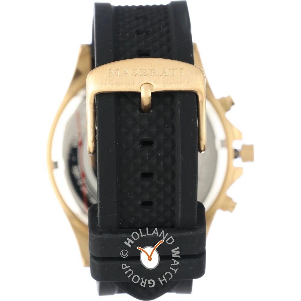 This Maserati watch has a case made of stainless steel with a diameter of 44 mm and is fitted with a rubber band. Inside the case lies a Miyota movement and the watch features a Mineral crystal.