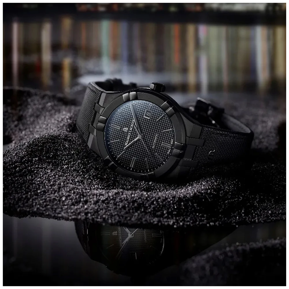 This Maurice Lacroix watch has a case made of stainless steel with a diameter of 42 mm and is fitted with a Textile over leather band. Inside the case lies a Sellita movement and the watch features a Sapphire crystal.