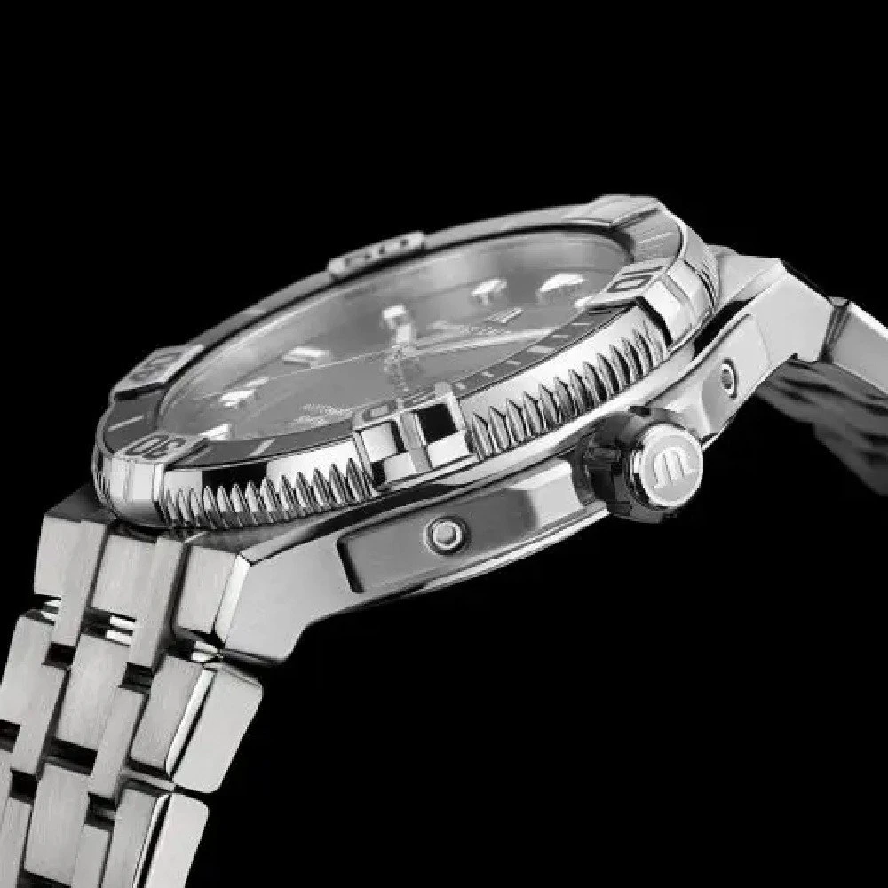 This Maurice Lacroix watch has a stainless steel case 43 mm in diameter and is fitted with a metal strap. Inside the case lies a Sellita movement and the watch features a Sapphire crystal.