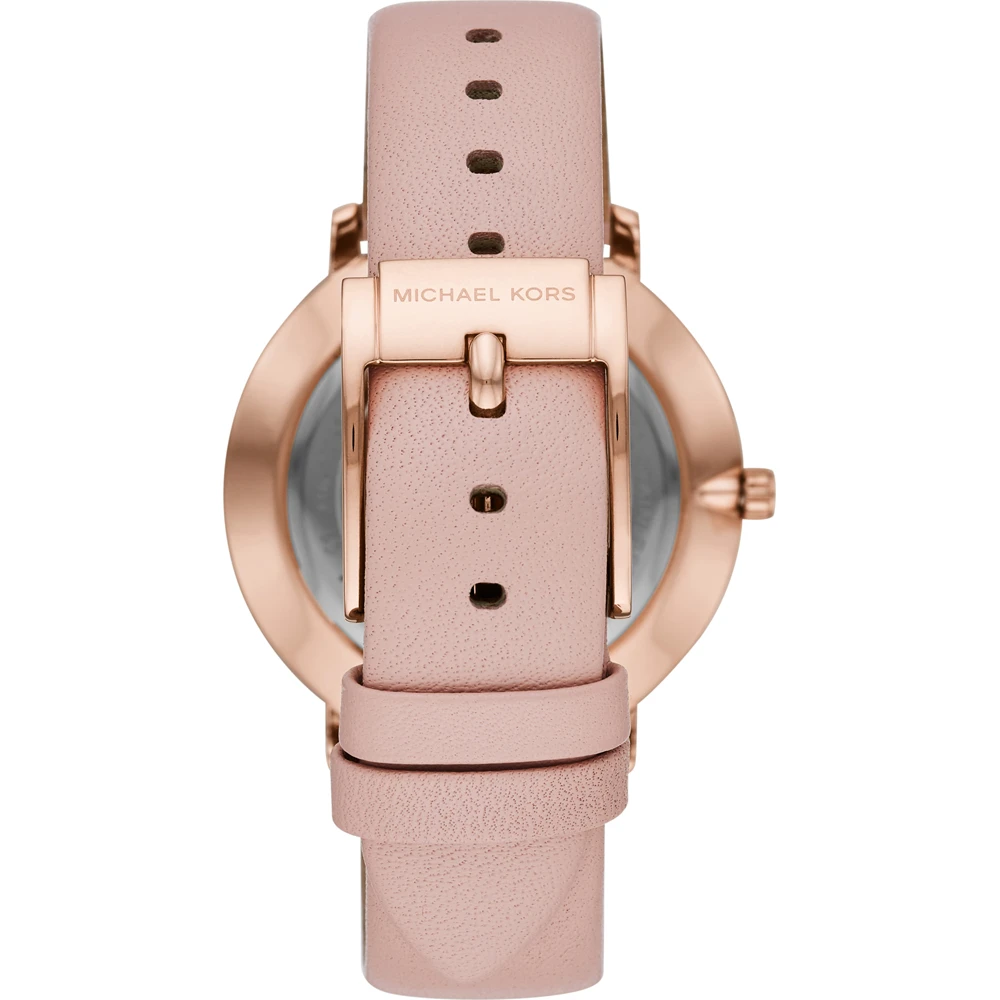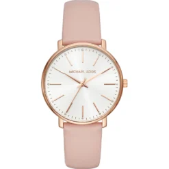 This Michael Kors watch has a case made of stainless steel with a diameter of 38 mm and is fitted with a leather band. Inside the case lies a Seiko Instruments Inc. movement and the watch features a Mineral crystal.