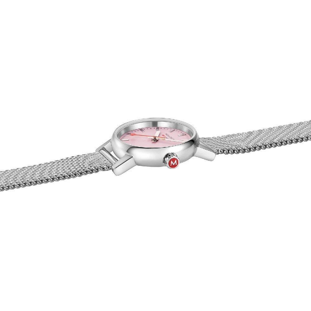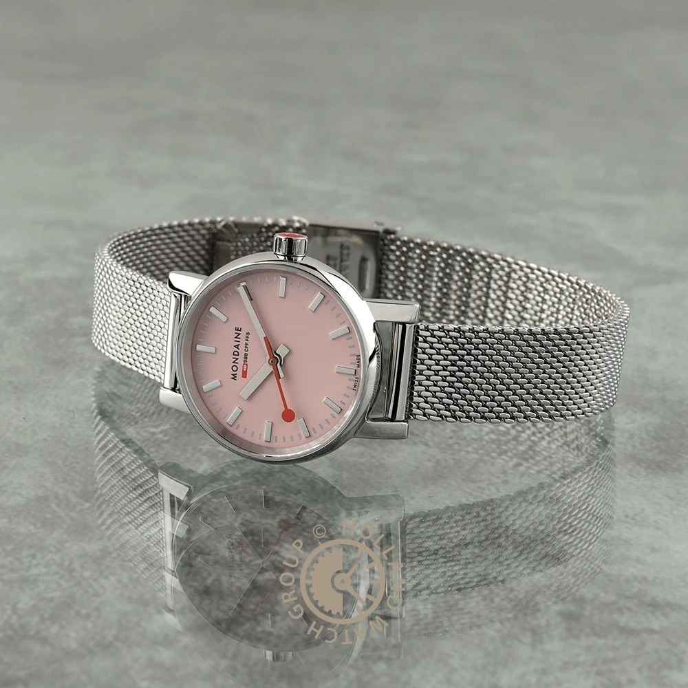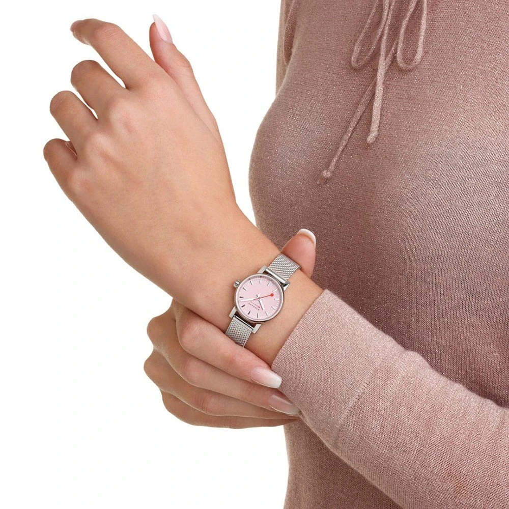 This Mondaine watch has a case made of stainless steel with a diameter of 26 mm and is fitted with a metal band. Inside the case lies a Ronda movement and the watch features a Sapphire crystal.