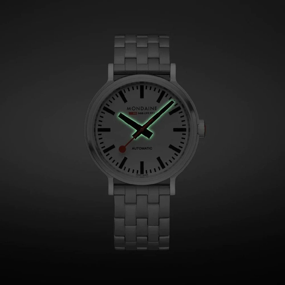 This Mondaine watch has a case made of stainless steel with a diameter of 41 mm and is fitted with a metal band. Inside the case lies a Sellita movement and the watch features a Mineral crystal.