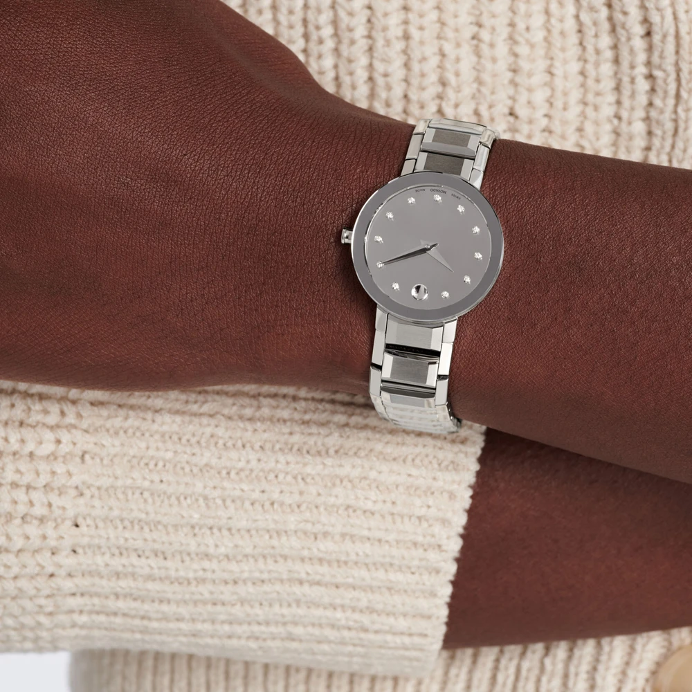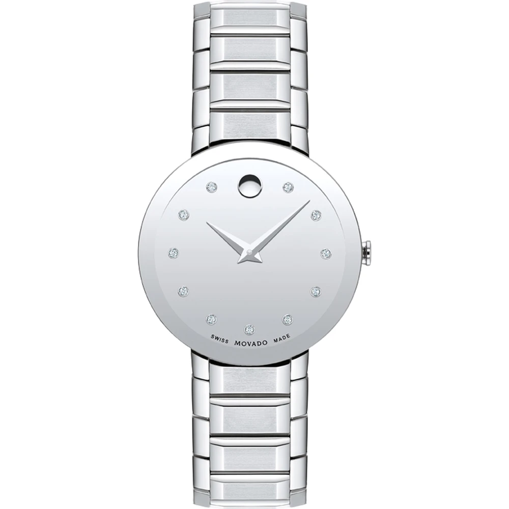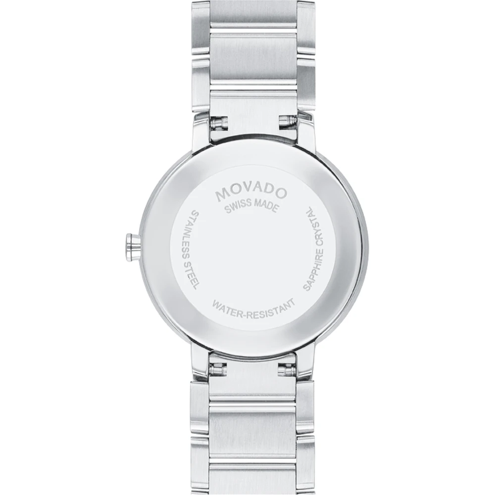 This Movado watch has a case made of stainless steel with a diameter of 28 mm and is fitted with a metal band. Inside the case lies a Ronda movement and the watch features a Sapphire crystal.