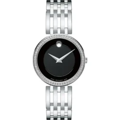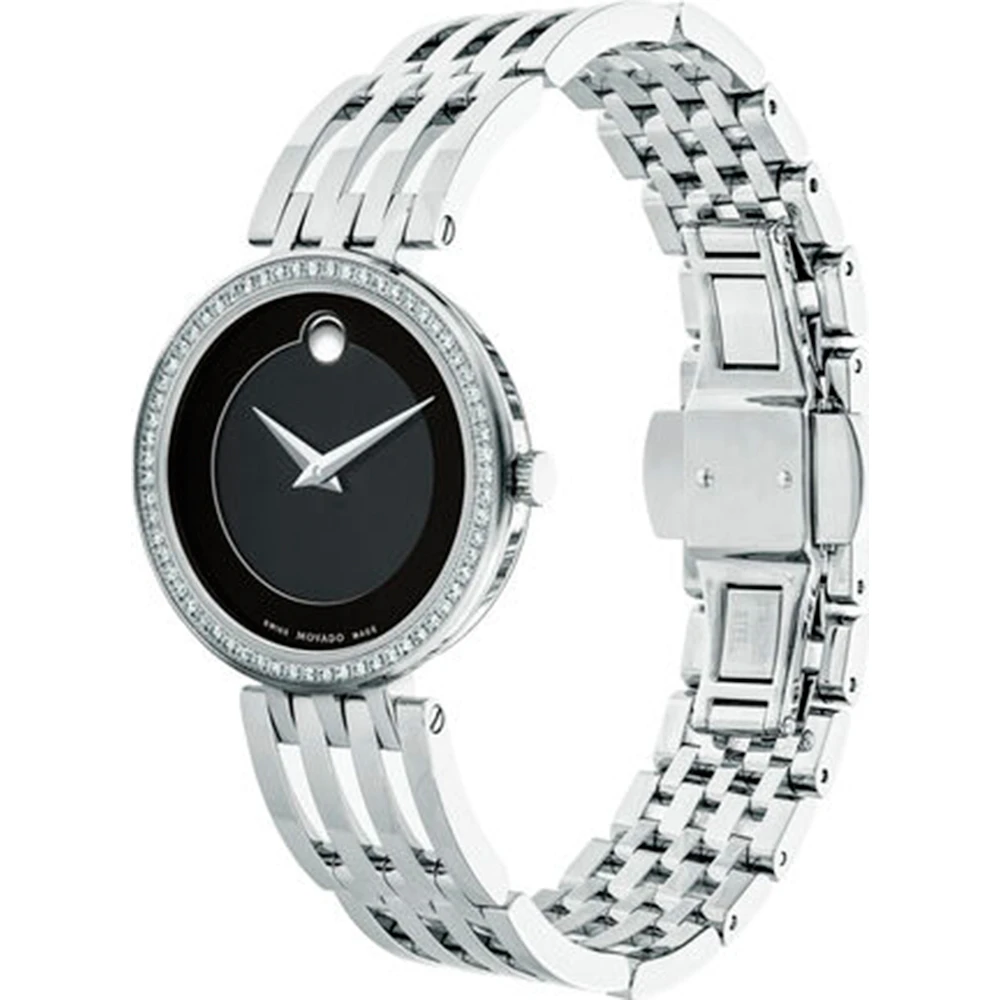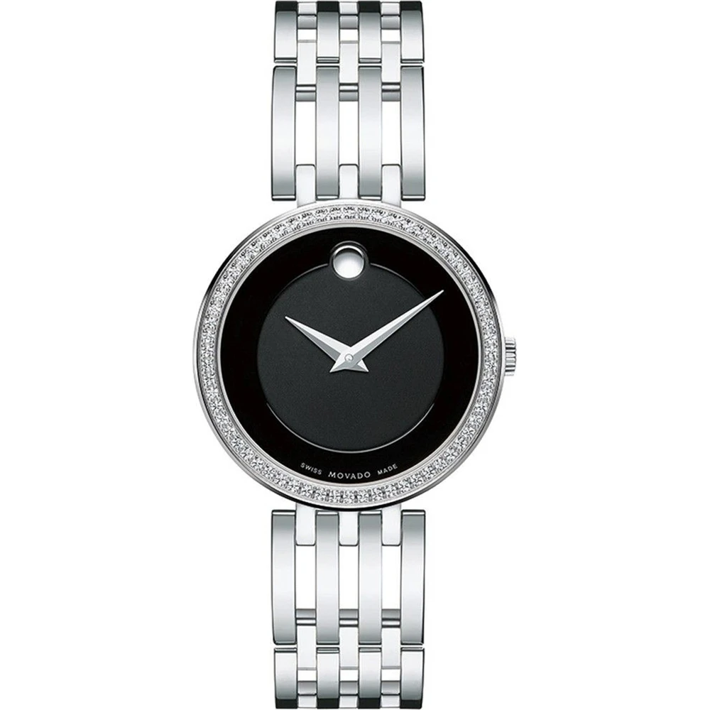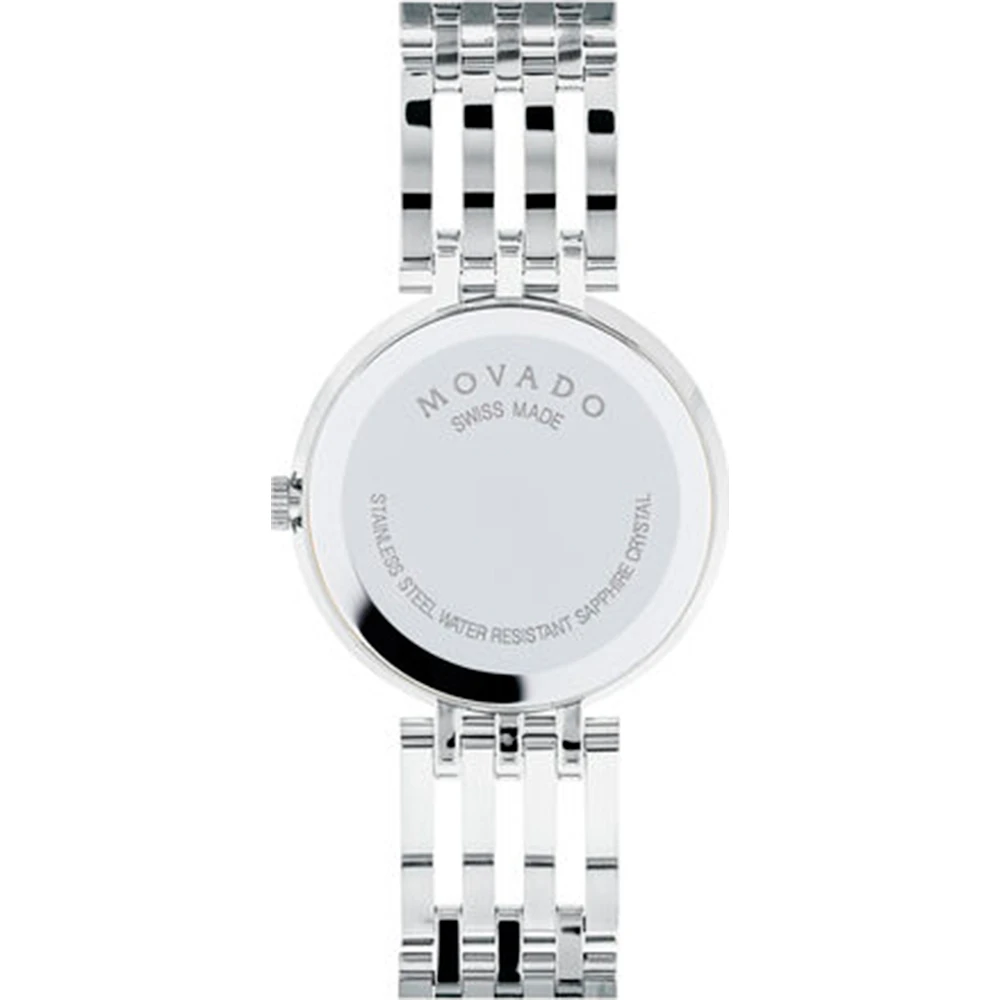 This Movado watch has a case made of stainless steel with a diameter of 28 mm and is fitted with a metal band. Inside the case lies a ETA movement and the watch features a Sapphire crystal.
