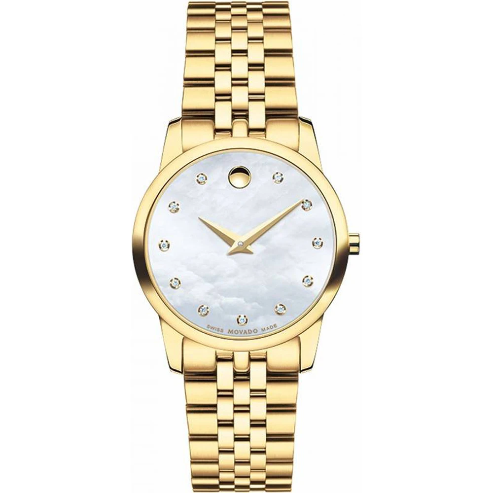 This Movado watch has a case made of stainless steel with a diameter of 28 mm and is fitted with a metal band. Inside the case lies a ETA movement and the watch features a Sapphire crystal.
