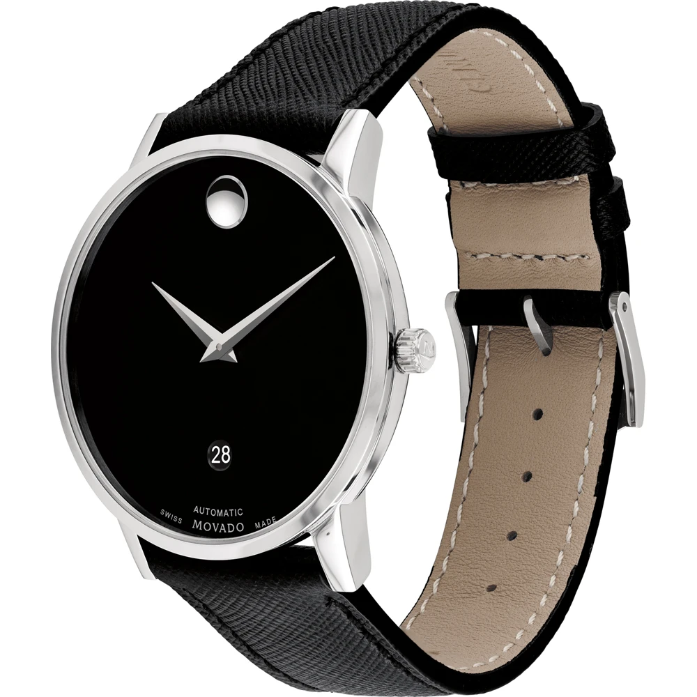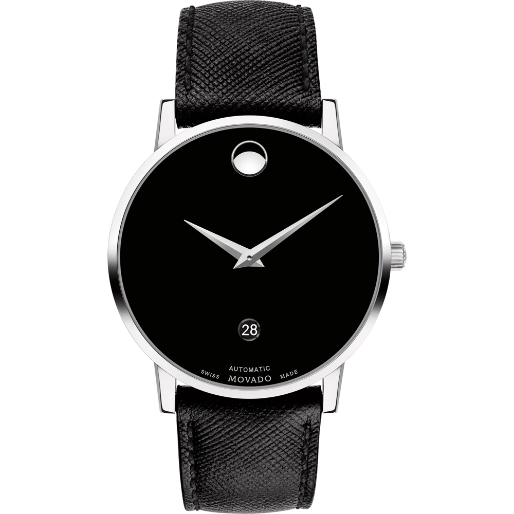 This Movado watch has a case made of stainless steel with a diameter of 40 mm and is fitted with a leather band. Inside the case lies a ETA movement and the watch features a Sapphire crystal.