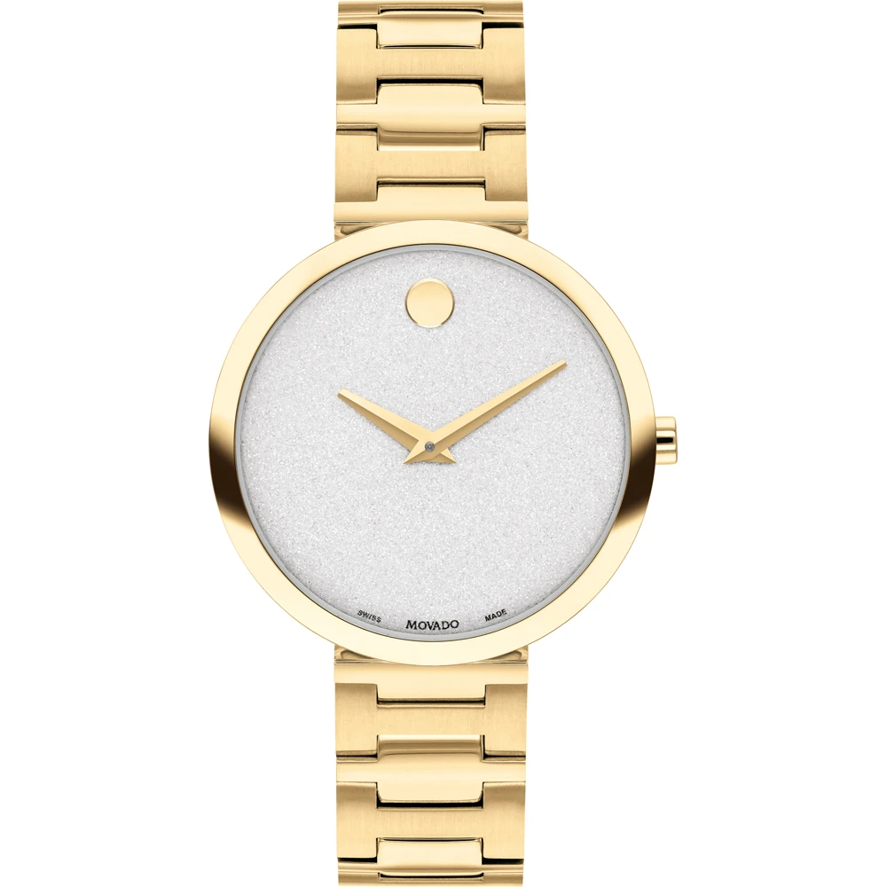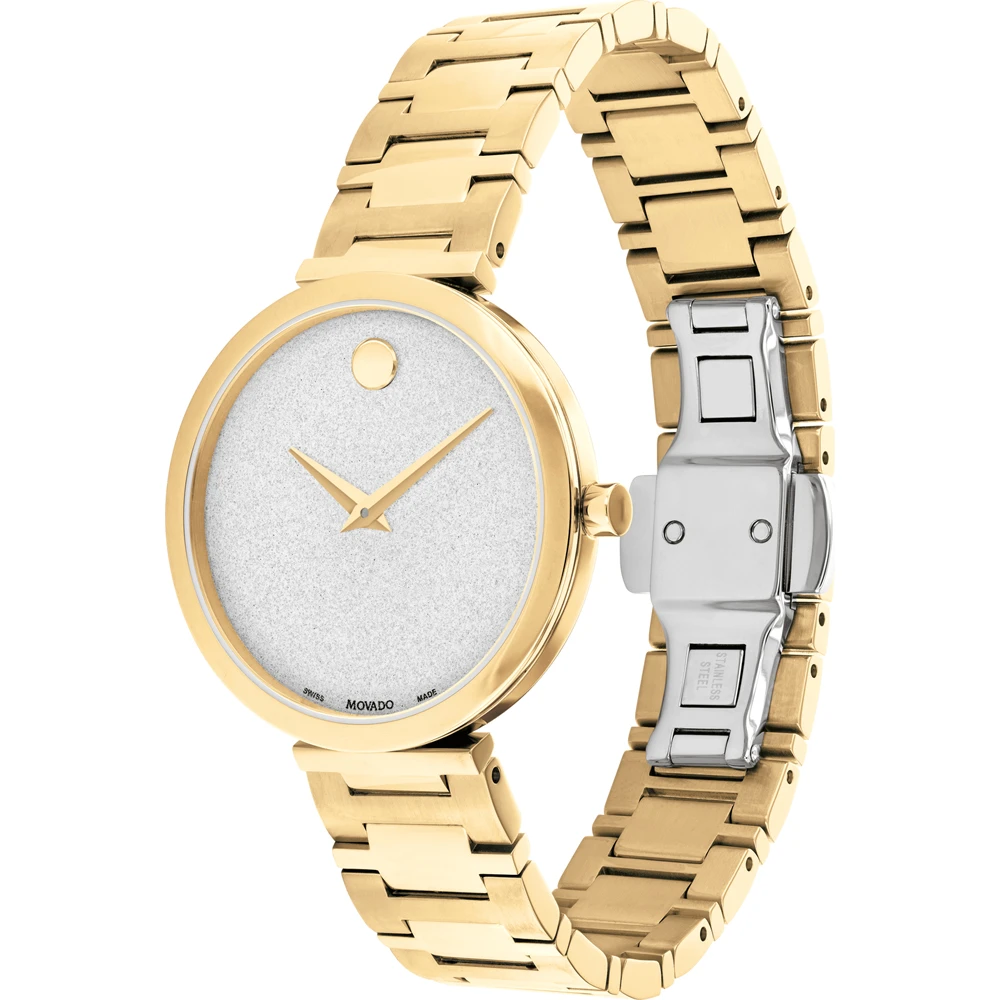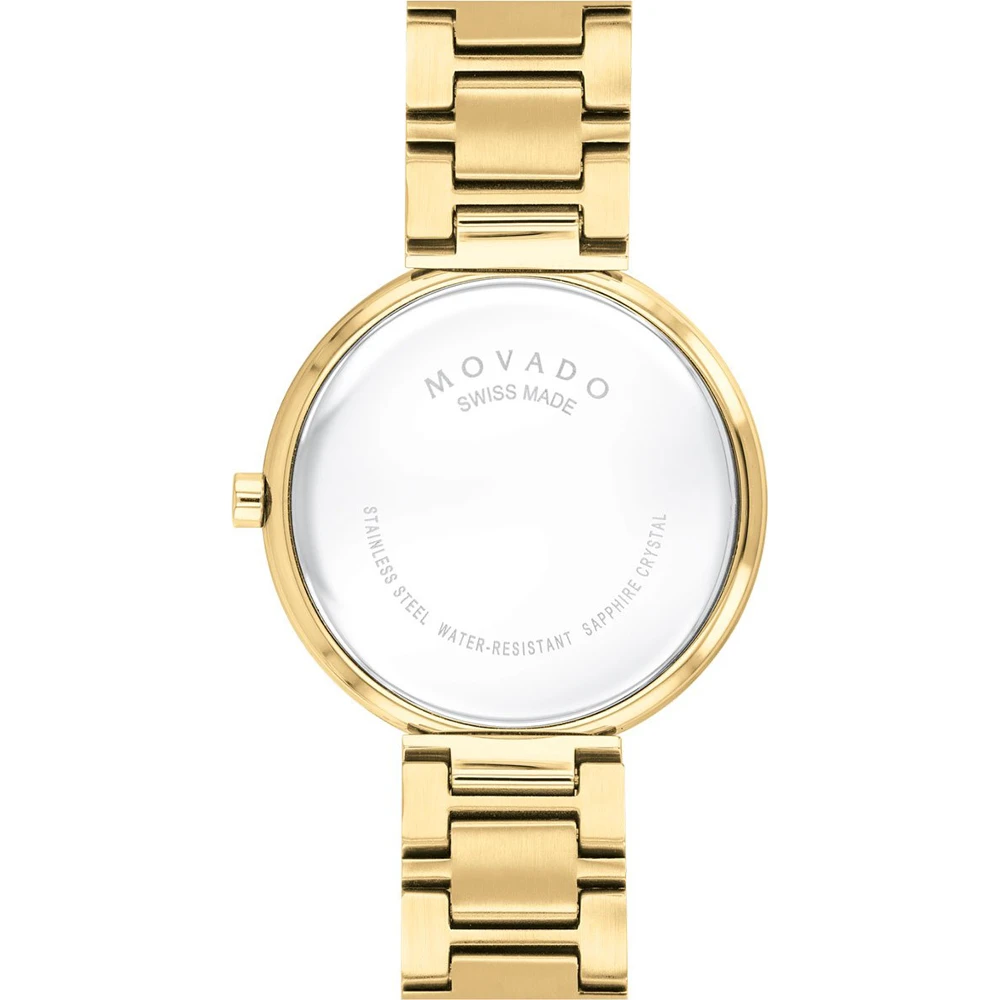 This Movado watch has a case made of stainless steel with a diameter of 32 mm and is fitted with a metal band. Inside the case lies a Ronda movement and the watch features a Sapphire crystal.