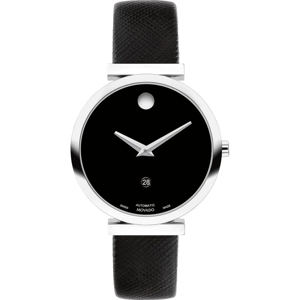 This Movado watch has a case made of stainless steel with a diameter of 32 mm and is fitted with a leather band.