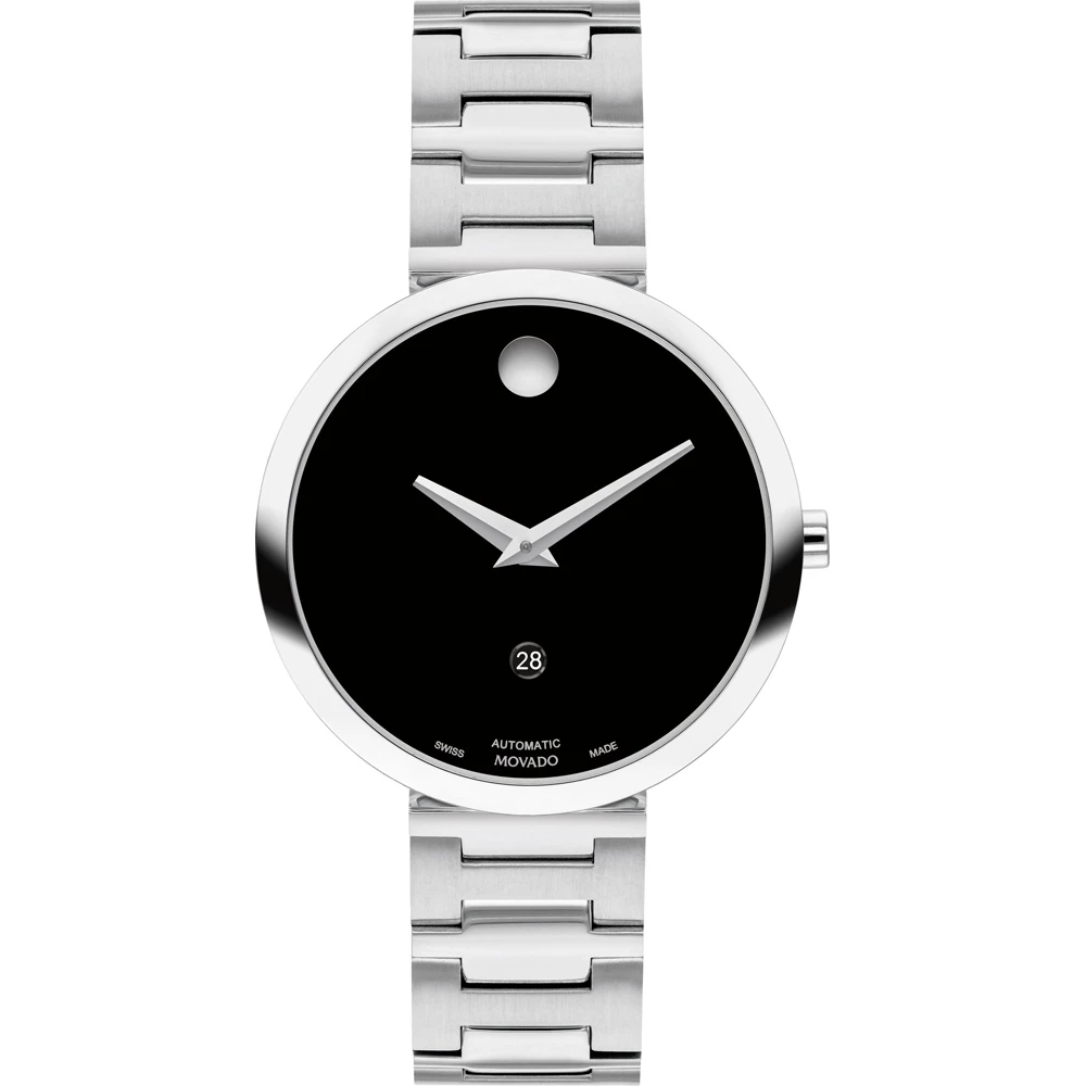 This Movado watch has a case made of stainless steel with a diameter of 32 mm and is fitted with a metal band.