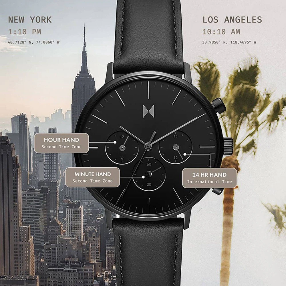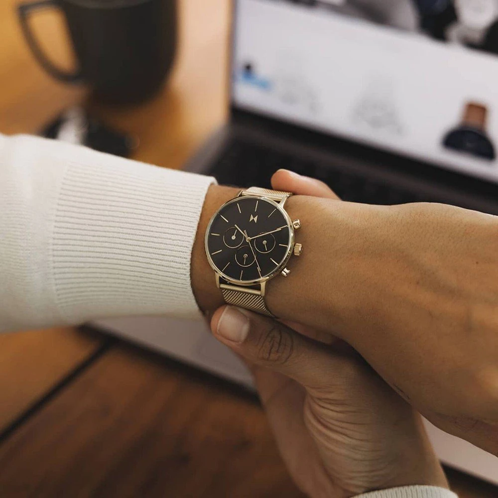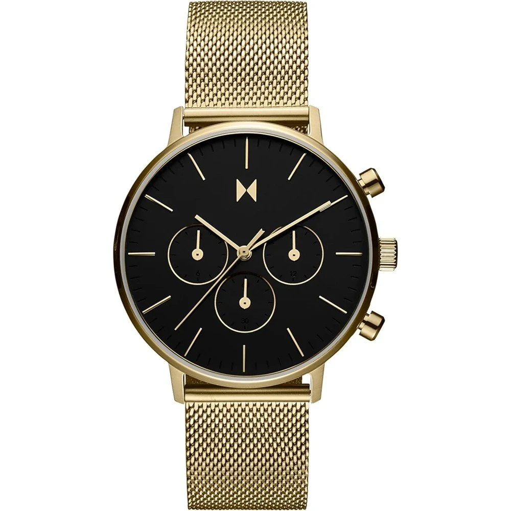 This MVMT watch has a case made of stainless steel with a diameter of 42 mm and is fitted with a metal band. Inside the case lies a Seiko movement and the watch features a Mineral crystal.