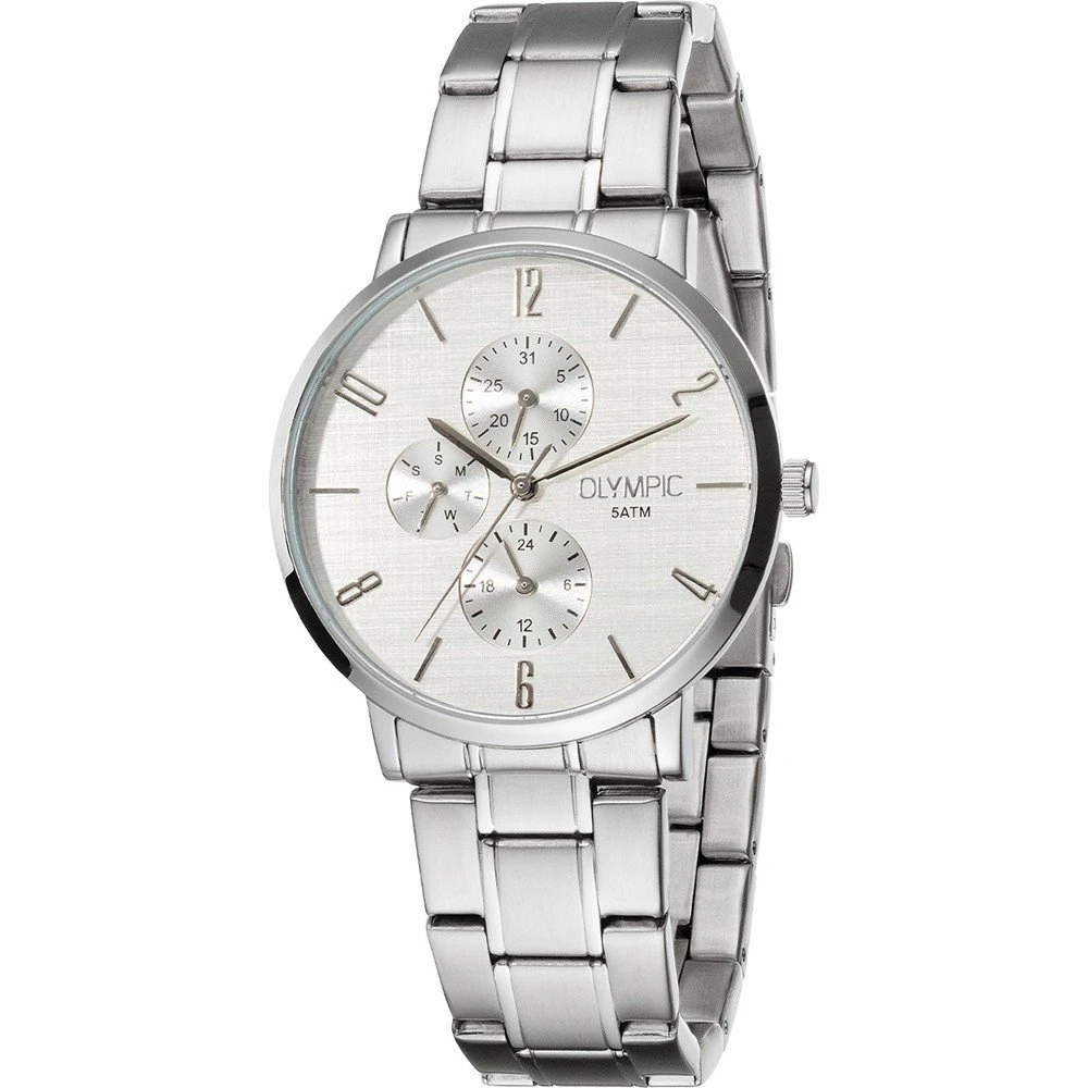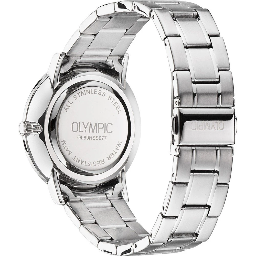 This Olympic watch has a case made of stainless steel with a diameter of 40 mm and is fitted with a metal band. Inside the case lies a Miyota movement and the watch features a Mineral crystal.