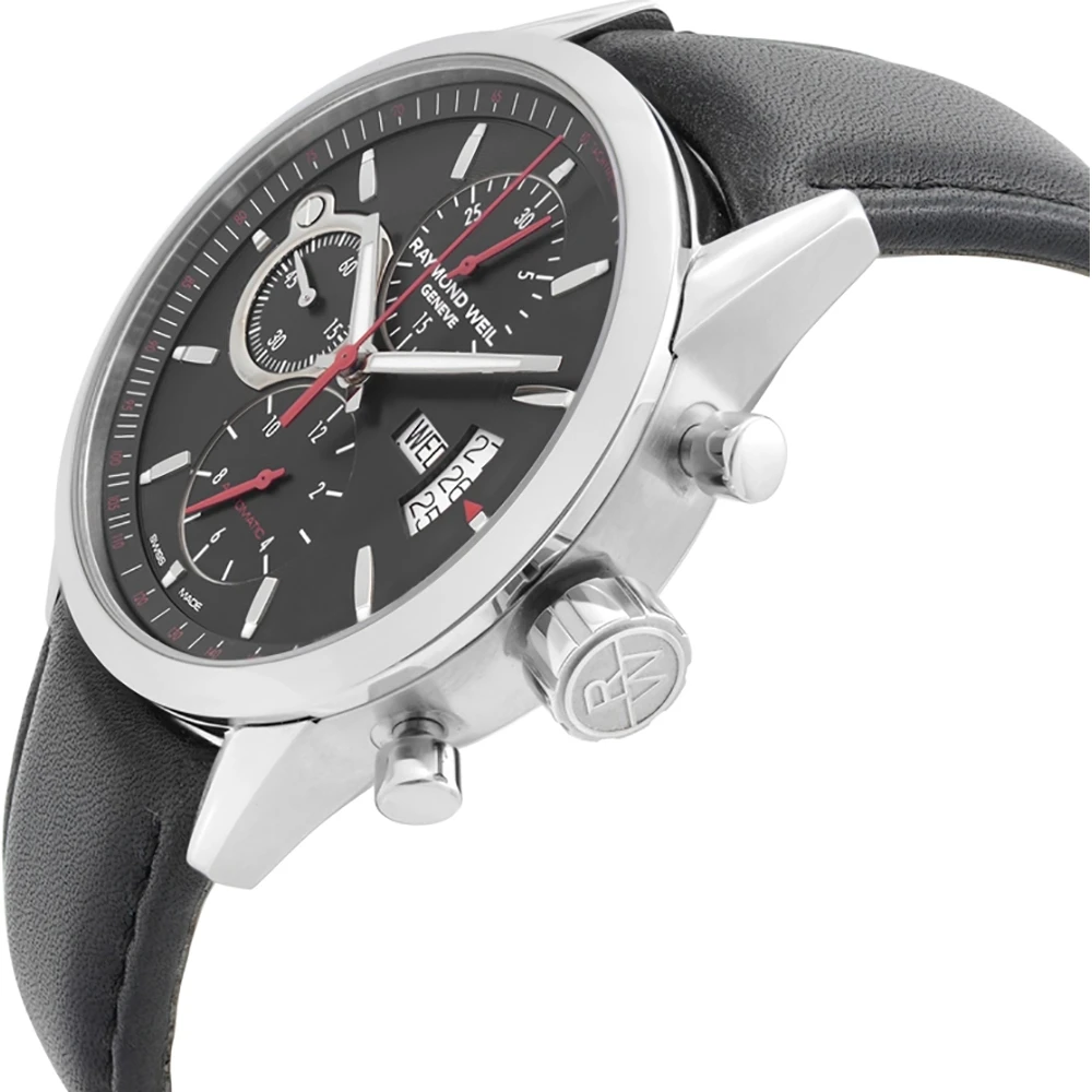 This Raymond Weil watch has a case made of stainless steel with a diameter of 42 mm and is fitted with a leather band. Inside the case lies a movement and the watch features a Sapphire crystal.