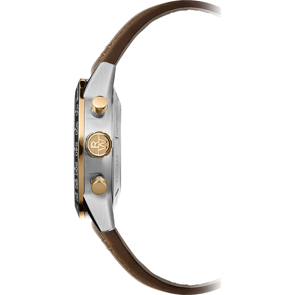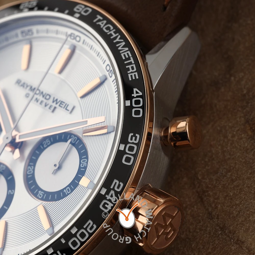 This Raymond Weil watch has a case made of stainless steel with a diameter of 43.5 mm and is fitted with a leather band. Inside the case lies a Sellita movement and the watch features a Sapphire crystal.